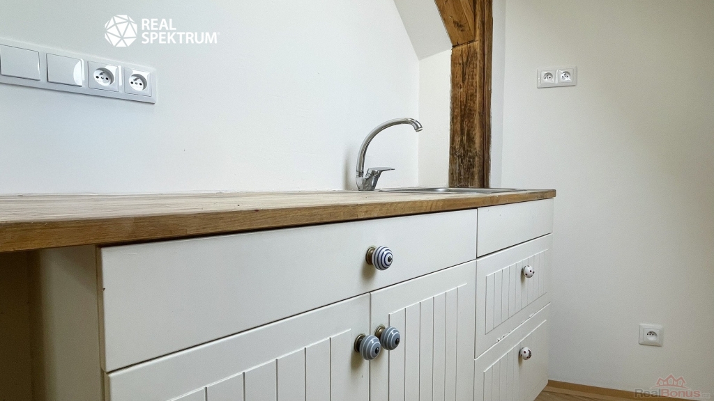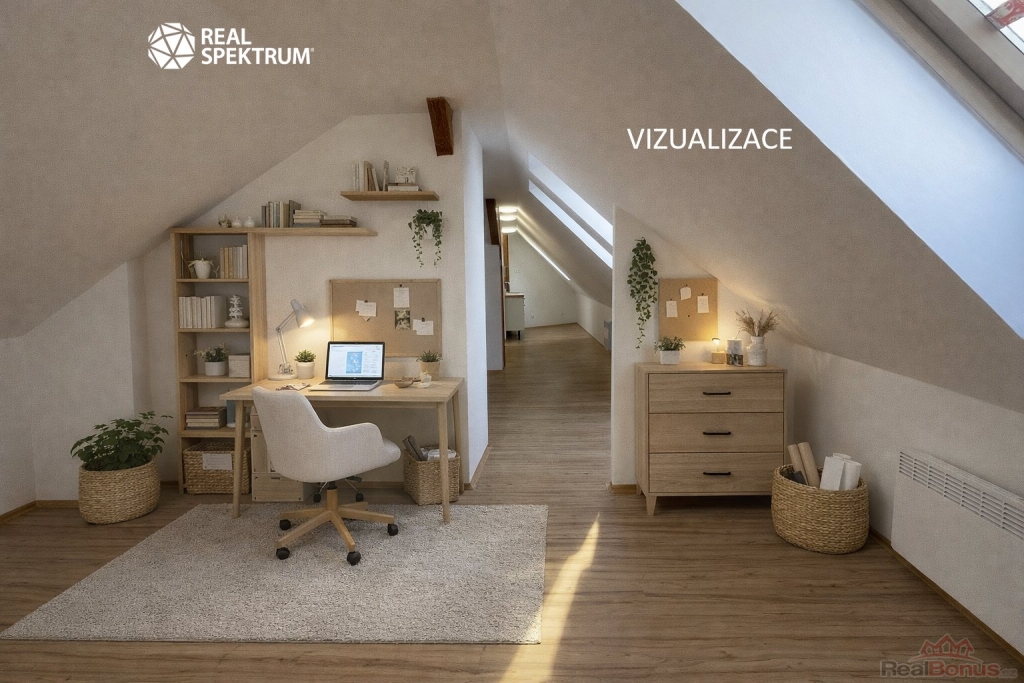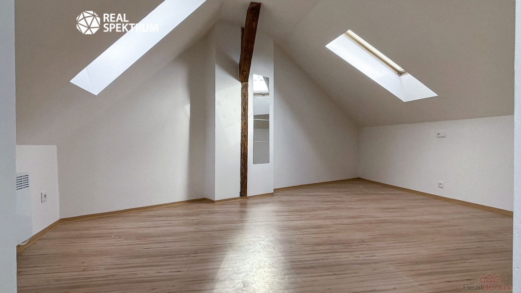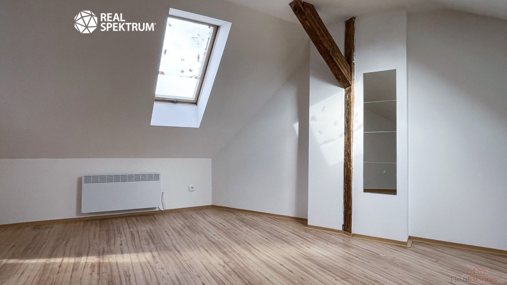 Byt vznikl přestavbou půdy, což potvrzují přiznané dřevěné trámy, které podtrhují stylově propojený prostor po celé délce. Díky střešním oknům je interiér dostatečně prosvětlený a podkrovní dispozice vytváří útulnou atmosféru. Proto je tato půdní vestavba ideální jako pohodlné hnízdečko pro jednotlivce nebo pár, kteří mají rádi originální prostor vybízející ke kreativitě v zařizování. Byt je v horním patře umístěn jako jediný, což znamená absenci zvuků od sousedů. Majitelce nevadí menší domácí mazlíček.