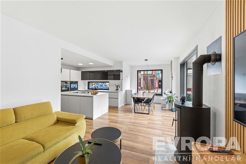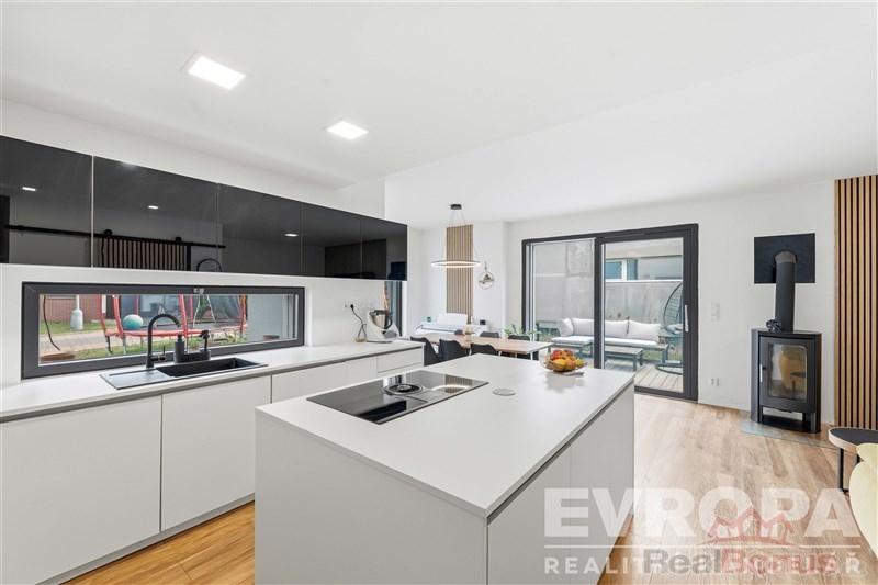 Dominantou rodinného domu je obývací pokoj s kuchyní. Vstup na terasu umožňuje HS portálové okno. Dalším prostorem k využití je i mezonetové patro nad ložnicí. Momentálně využívané jako dětská hernička. Nicméně prostor může sloužit i jako odpočinkový prostor pro čtení, relaxaci či meditaci. Necháme už na vaší fantazii.