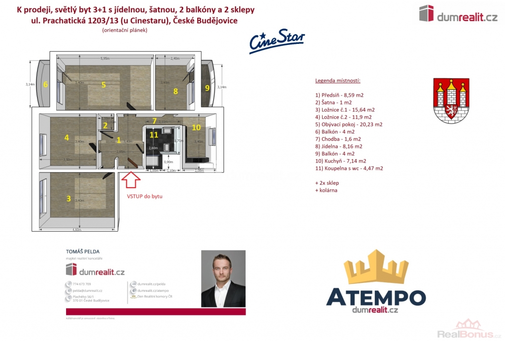 Cena je včetně provize RK a právního servisu. Více informací Vám poskytne makléř Tomáš Pelda., Dumrealit.cz Vám zprostředkuje prodej světlého, prostorného a částečně zrekonstruovaného bytu 3+1 s jídelnou, šatnou, 2 balkóny a 2 sklepy, v osobním vlastnictví na adrese Prachatická 13/1203 (u multikina Cinestar) ve městě České Budějovice. Bytová jednotka se nachází v 6. podlaží zatepleného panelového domu s výtahem a dvěma sklepy, přičemž jeden ze sklepů se nachází přímo na patře. Byt je situovaný na severovýchodní a jihozápadní světovou stranu. Měsíční náklady na provoz bytu pro 4 osoby činí 4.861,- Kč (fond oprav, vodné, stočné, vytápění, el. energie atd.) + elektřina a internet. Veškerá občanská vybavenost (školka, škola, praktický lékař, obchody, pošta, MHD) je v místě bydliště. Podrobné rozkreslení dispozice naleznete na orientačním plánku mezi fotografiemi. Bytovou jednotku lze přestavět na 4+1. Byt je připraven k okamžitému nastěhování. Zajistíme Vám financování a veškerý právní servis. Více informací Vám poskytne realitní makléř Tomáš Pelda z realitní kanceláře A TEMPO fungující pod ochranou známkou dumrealit.cz. Ev. číslo: 655127. Energetický štítek: C (110 kWh/m2/rok).