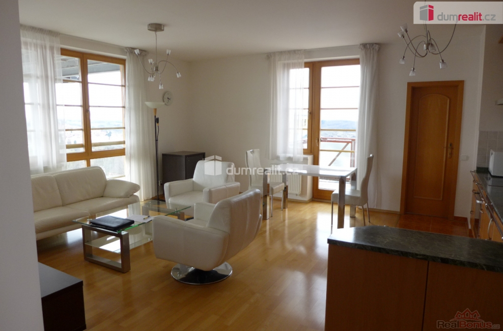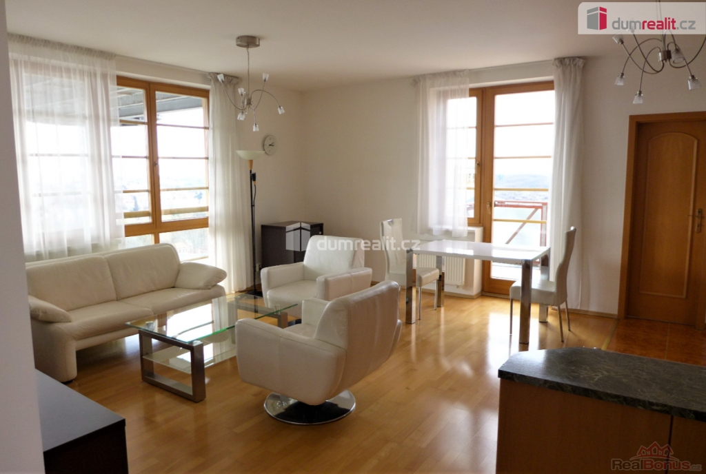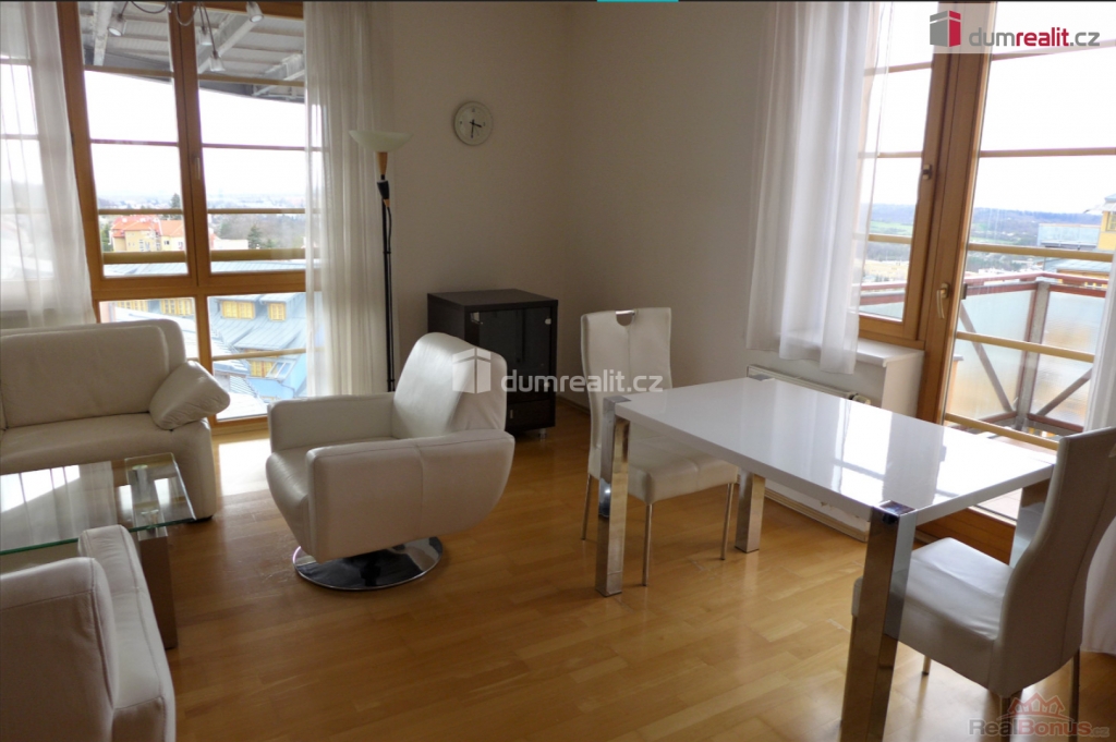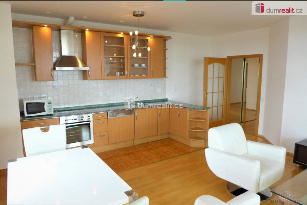 Dominantou bytu je krásně prosvětlený vzdušný obývací pokoj 30,4 m zařízený kvalitním nábytkem, s francouzským oknem a vstupem na terasu. Součástí místnosti je i kuchyňská linka plně vybavená kvalitními spotřebiči. Ložnice 16,8 m je též velmi prostorná a světlá, v koupelně 7,5 m s oknem naleznete velkou vanu i sprchový kout, zvlášť je WC s umyvadlem. V hale o rozloze 14,4 m jsou umístěné vestavné skříně a další úložný nebo pracovní prostor nabízí velká komora s oknem o rozloze 3,8 m. Celý interiér bytu včetně vybavení obývacího pokoje je krásně sladěný a působí velice příjemně. V suterénu domu je umístěna dobře zabezpečená sklepní kóje 2 m a garážové stání v podzemní garáži. Další gar. stání v objektu je možné pronajmout. K dispozici obyvatelům domu s 24 hodinovou recepcí je i posilovna.