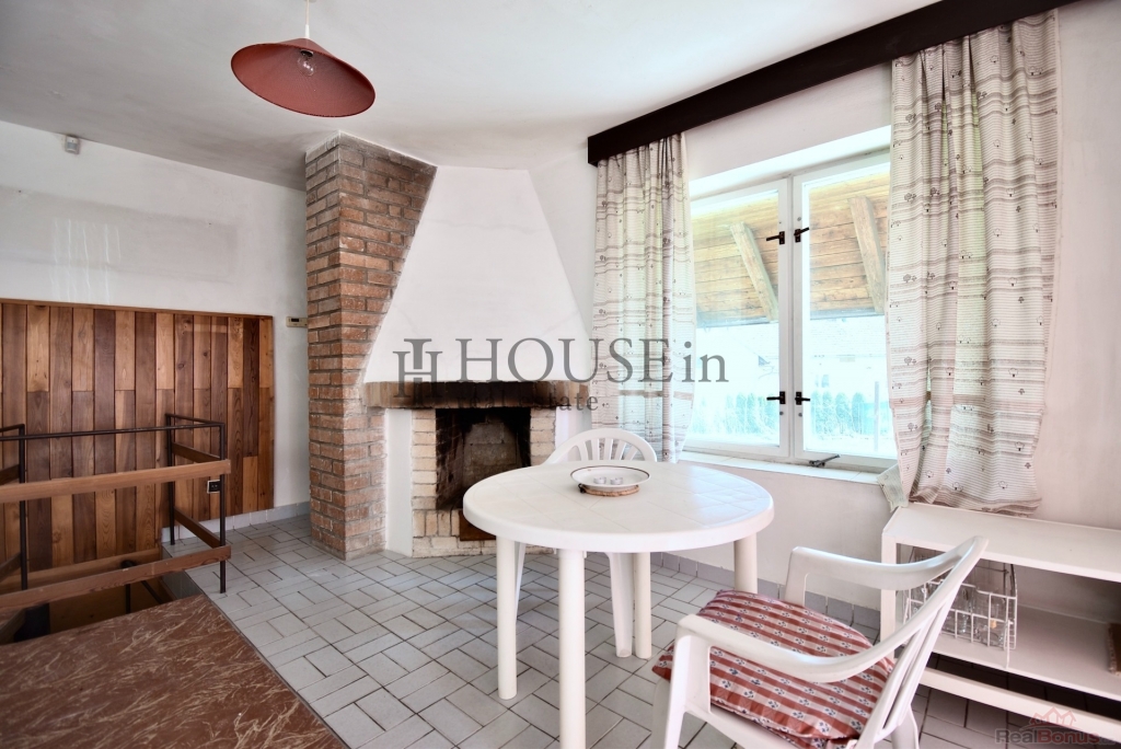 Kuchyňská linka se spotřebiči (plynový sporák, trouba, digestoř, lednice s mrazákem), krb na dřevo, elektrický kotel a elektrický bojler.