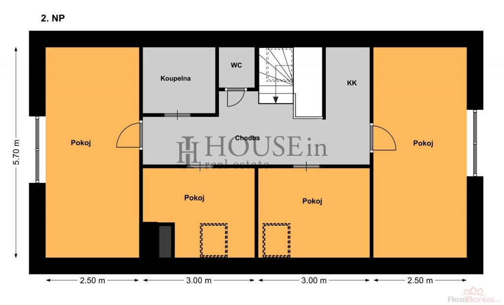 2. NP: chodba, prostorný obývací pokoj, dvě ložnice, koupelna s vanou, samostatná toaleta, velká komora a půda vhodná k uložení věcí