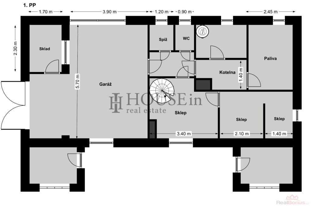 3. PP: garáž, dílna, sauna s ochlazovacím bazénkem, prádelna, uhelna, spíž, toaleta, kotelna, sklad paliva, pivnice s možností vybudování krbu, dvě skladové místnosti pod terasou
