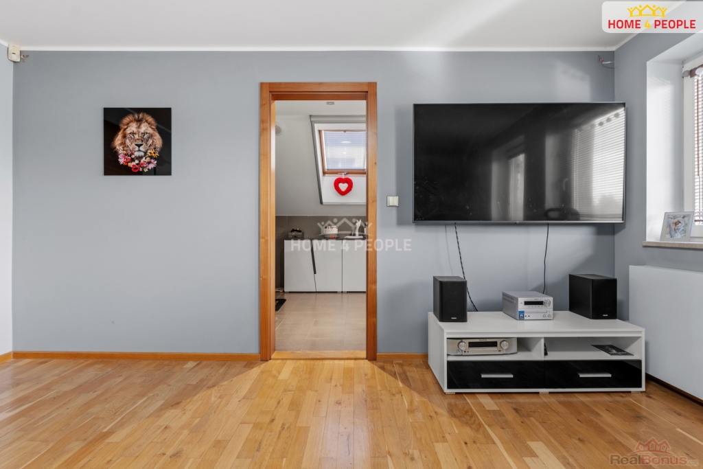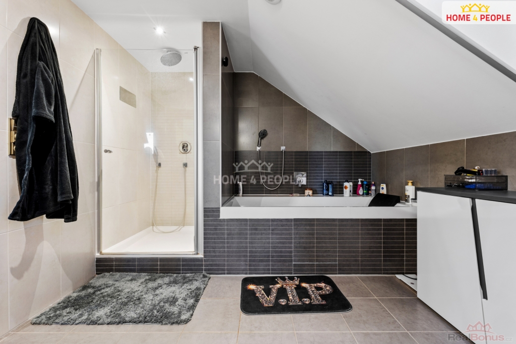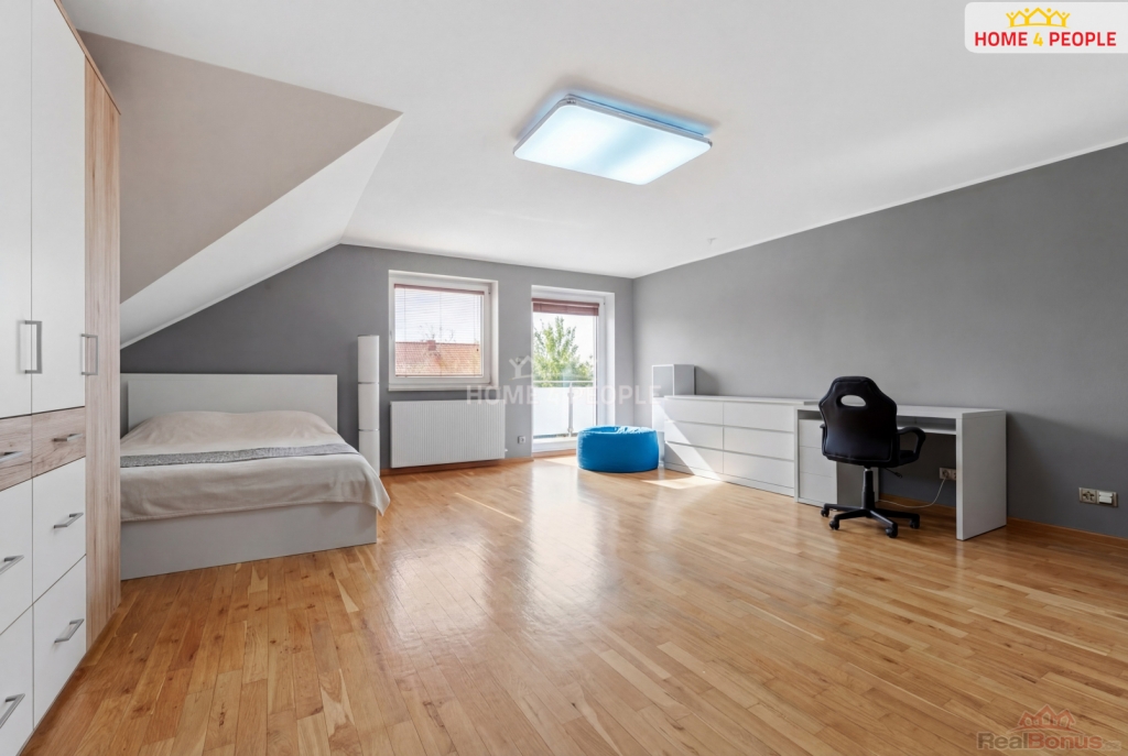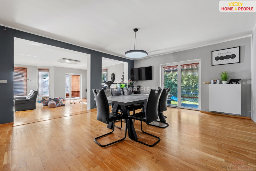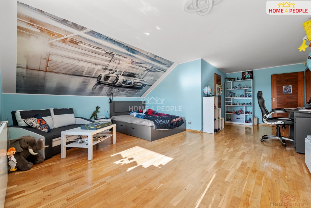 V přízemí domu vstoupíte do prostorné haly, kde se nachází prostorná technická místnost, koupelna s WC, velký obývací pokoj s krbem se vstupem na zahradu, moderní kuchyň s prostornou jídelnou a praktický sklad, pokoj pro hosty. Dřevěné schodiště Vás dovede do prvního patra, kde je umístěna ložnice se šatnou s vestavnými skříněmi pro uložení všech věcí a samostatnou koupelnou. Dále najdeme další 3 pokoje, kde v jednom z nich se opět nachází šatna, na chodbě je koupelna s WC a komora, vstup na půdu, která též pojme spoustu sezónních věcí.