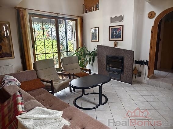 Hale v přízemí, jejíž podlahu tvoří vkusná a kvalitní dlažba, pohledově vévodí horkovzdušný krb s vložkou, napojený na domovní systém vytápění, což lze využít nejen v přechodových ročních období a lze jednoduše také přejít na hlavní způsob temperance, jež je zajištěna plynovým kotlem.