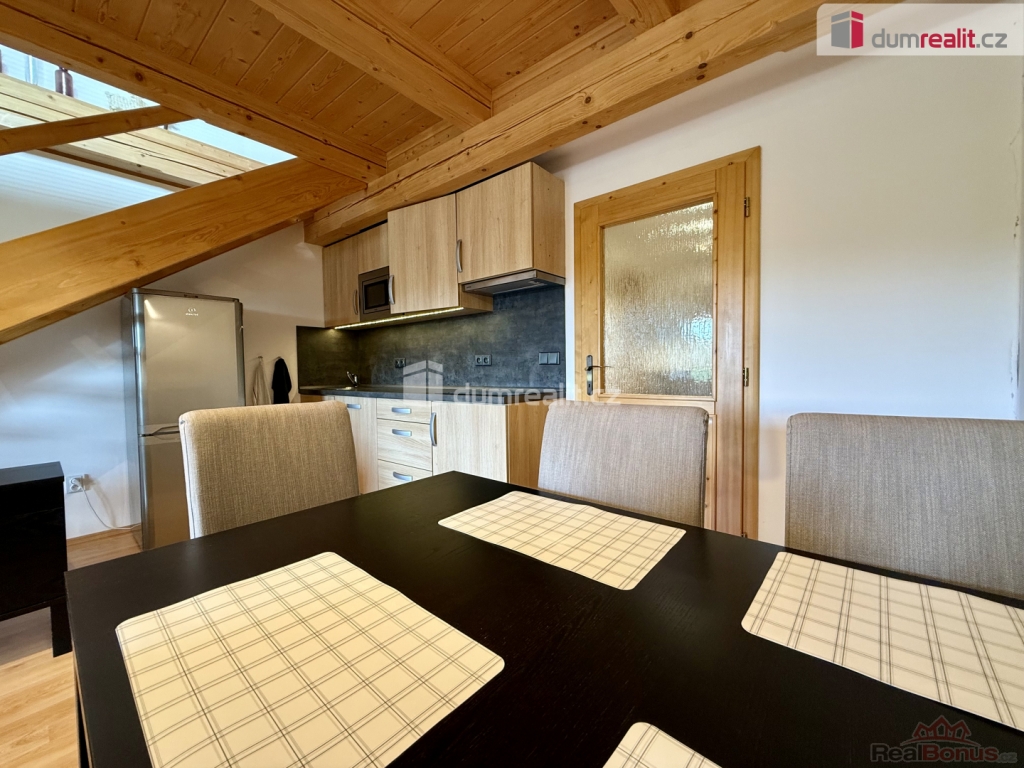 Vratná kauce 2 x měsíční nájem. Provize RK 1 x měsíční nájem. Včetně právního servisu., Pronájem exkluzivního podkrovního mezonetového bytu 3+kk o rozloze 74 m, který se nachází v atraktivní a žádané lokalitě Vítkovice v Krkonoších. Tento moderní byt nabízí komfortní bydlení v originálním prostoru s důrazem na kvalitu a design, ideální nejen pro milovníky hor a outdoorových aktivit.