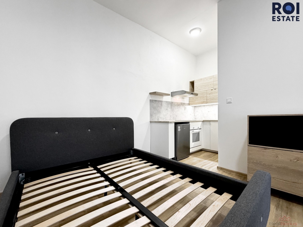 Byt je zařízený a připravený k nastěhování. V obytné části najdete postel, komodu, skříň a police pro dostatek úložného prostoru. Kuchyňský kout je vybaven lednicí, troubou, varnou deskou a digestoří.