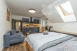 Obývací pokoj a kuchyňský kout - skříňky na míru, stůl a rozkládací sedací souprava, vstup na terasu, dominantou pokoje je manželská postel, nad kterou je střešní okno. Plně vybavená kuchyňská linka (vestavná kombinovaná mikrovlnná trouba s grilem, myčka, varná deska, odsavač par). Celková kapacita apartmánu je až 4 osoby, popřípadě lze přidat i přistýlku, což představuje ideální příležitost pro investici do rekreačního bydlení v oblíbené lokalitě Jeseníků.