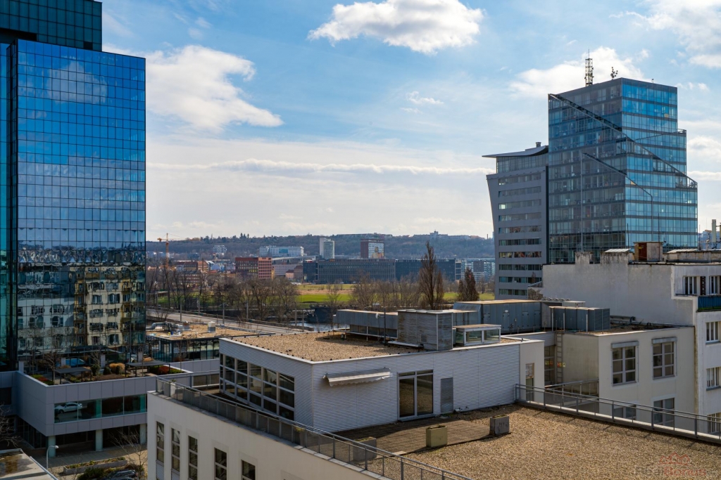 Velkou výhodou je umístění v posledním patře, díky kterému byt nabízí dostatek světla, soukromí a především krásný výhled na Prahu.