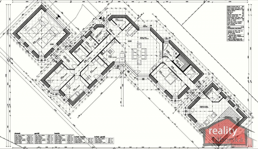 Celková plocha pozemku 2025 m2, zastavěná plocha 415 m2, užitná plocha domu 335 m2 + bazénový prostor 56,48 m2 + garáž 45,75 m2.