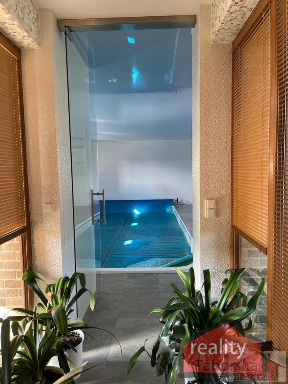 Součástí domu je také terasa ze severské borovice nad přírodním jezírkem s tekoucí vodou a s KOI kapry, bazénový prostor s vnitřním bazénem (56,48m2) a finská sauna (5,06m2).