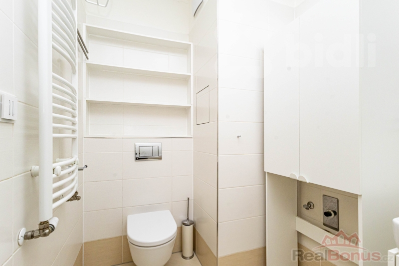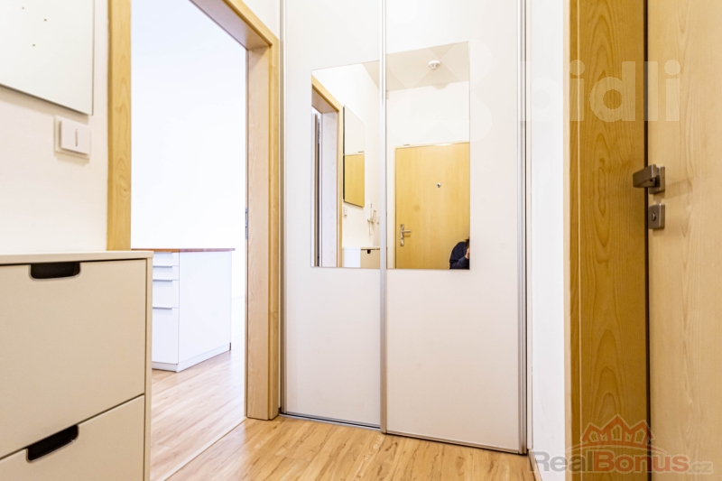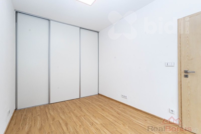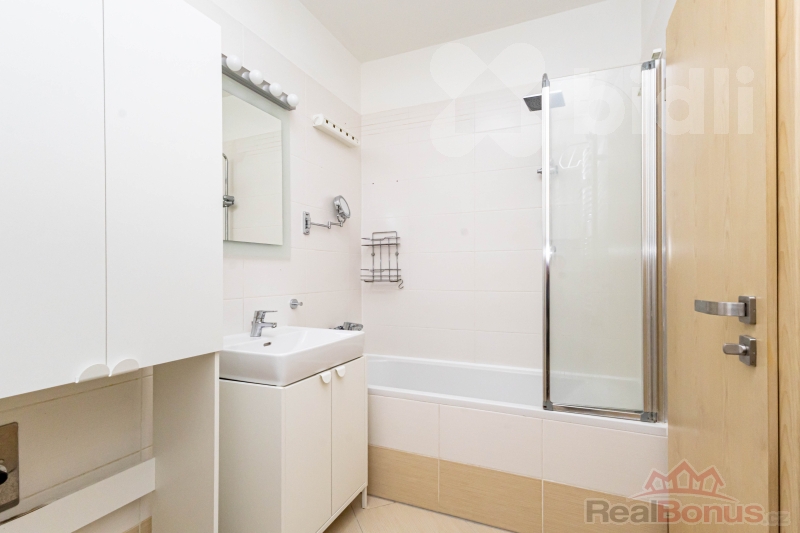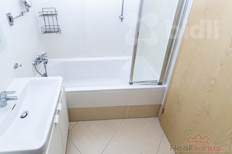 Ložnice je samostatná a prakticky řešená, s vestavěnou skříní po celé délce stěny. Koupelna je vybavena vanou se sprchovou zástěnou. Byt je udržovaný, ve velmi dobrém stavu a připravený k okamžitému užívání bez nutnosti dalších investic.
