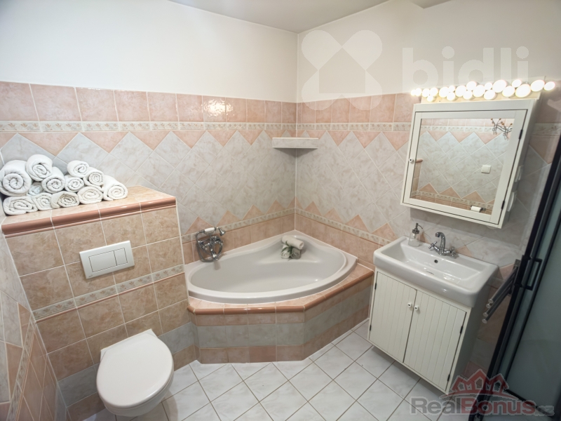 Interiér nabízí nadstandardní jídelnu a kuchyni, ohromný obývací pokoj s přímím vstupem na terasu, dvě prostorné neprůchozí ložnice, praktickou pracovnu, koupelnu s toaletou a další sam. toaletu.