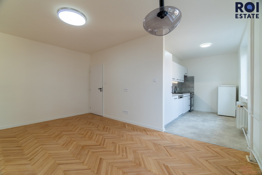 Dispozice zahrnuje dva pokoje a kuchyň vybavenou všemi spotřebiči, včetně myčky na nádobí. Na prostornou chodbu navazuje samostatná toaleta a koupelna s velkým sprchovým koutem a místem pro pračku.