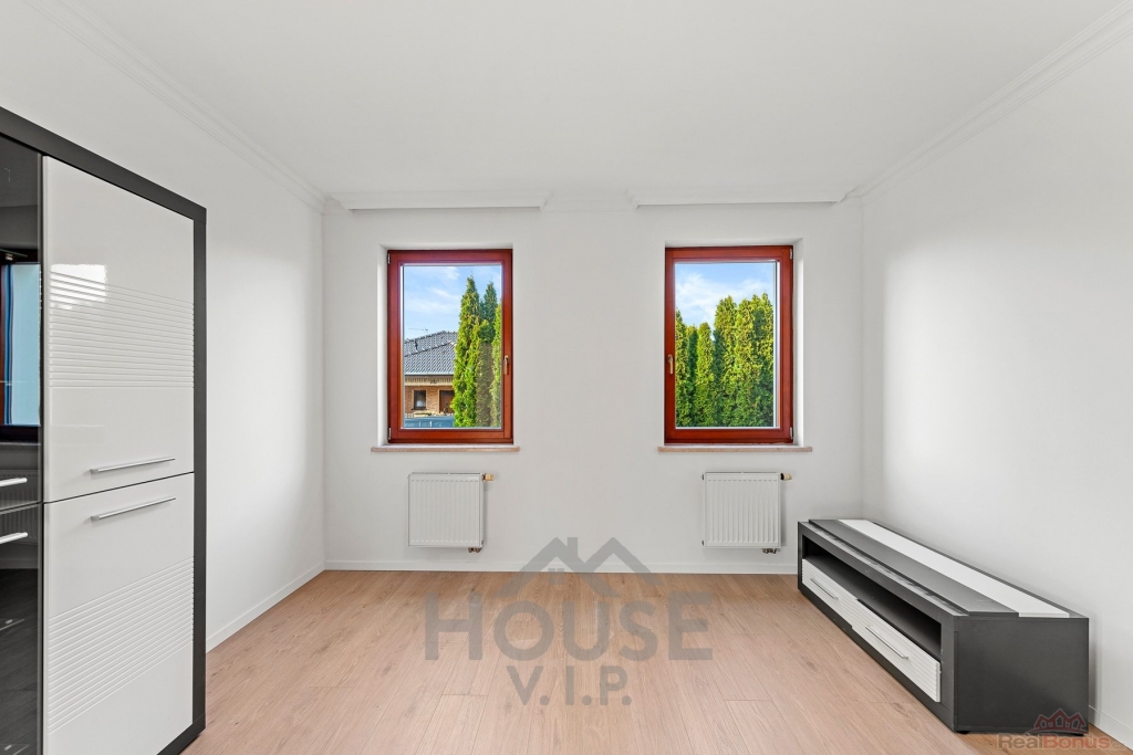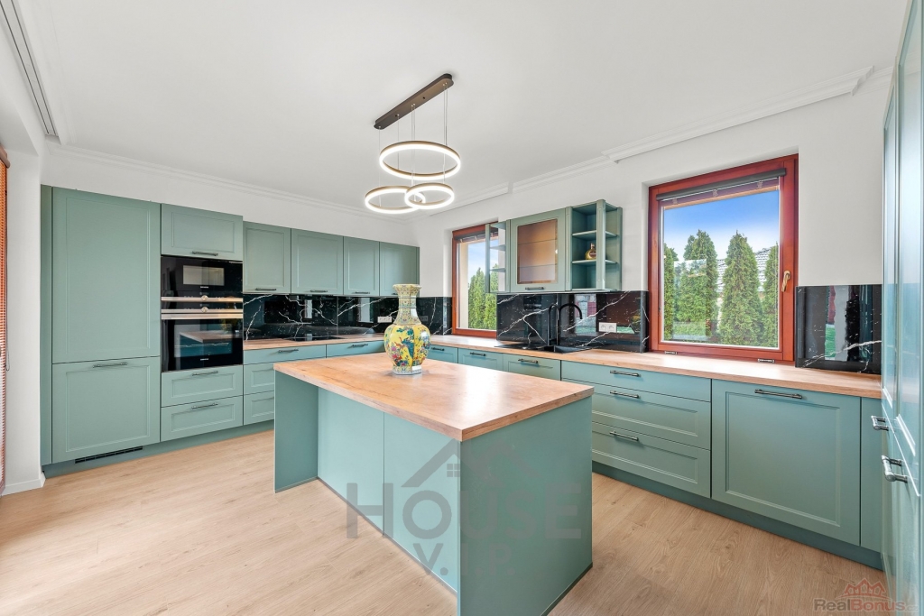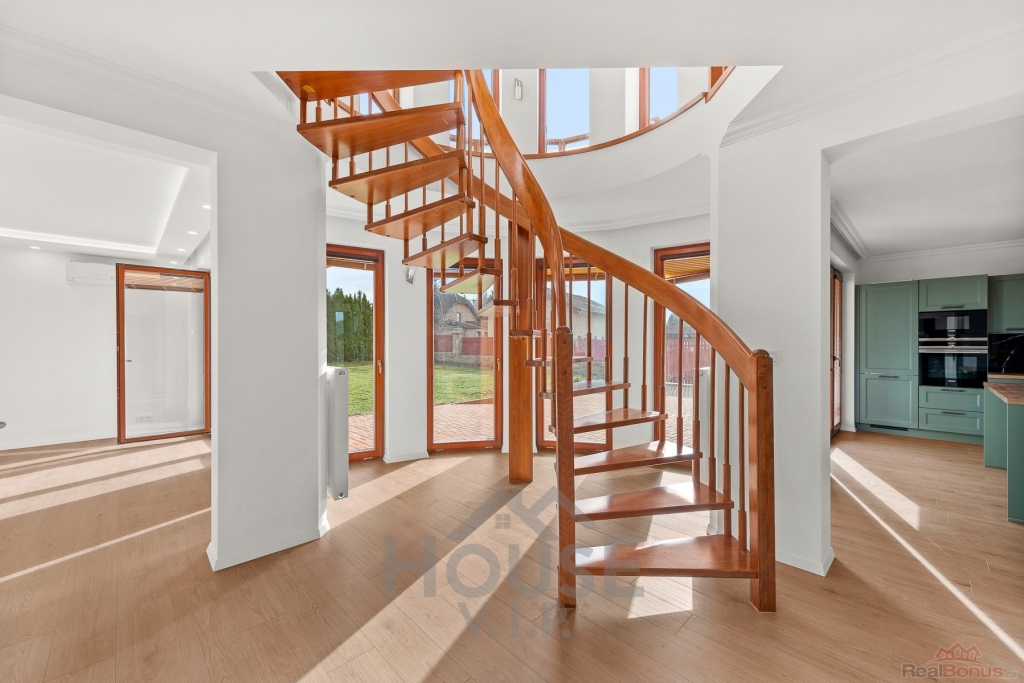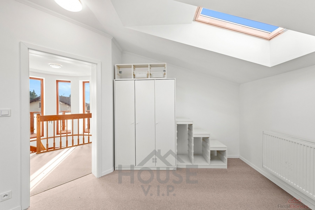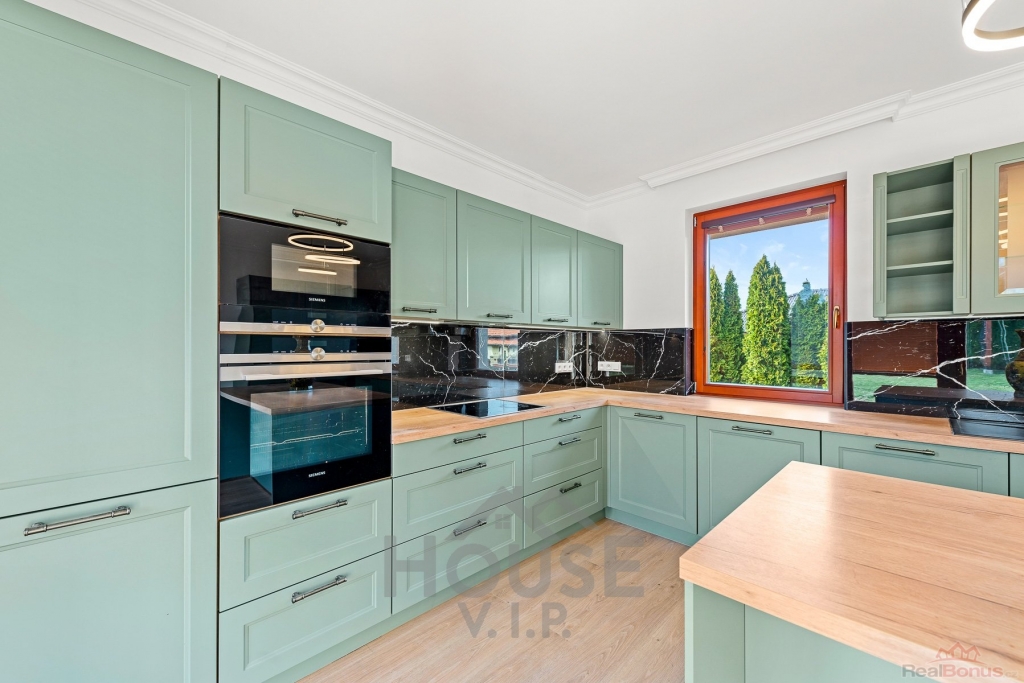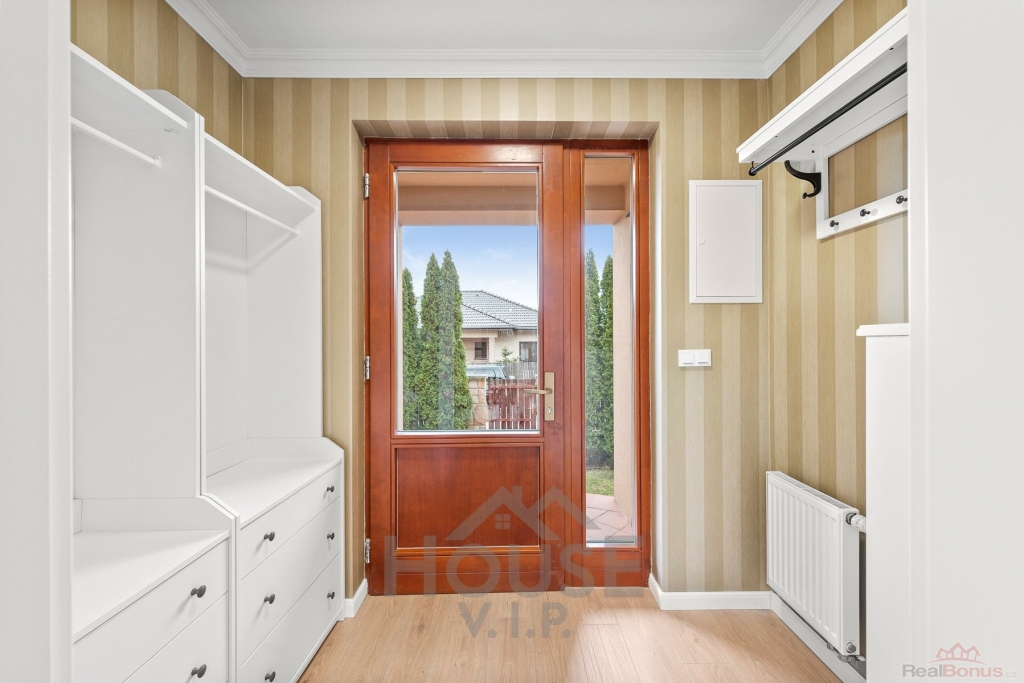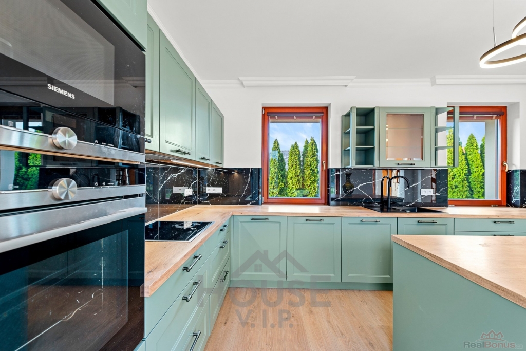 Součástí domu je zcela nová luxusní kuchyň na míru, vybavená spotřebiči značky Siemens, která potěší i náročné uživatele. Velká lednice, velký mrazák se sedmi přihrádkami, lednice na nápoje a spousta úložného prostoru.