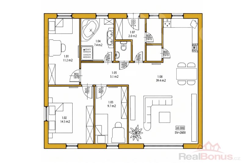 Dispozice domu je 4+kk a nabízí užitnou plochu 100 m2, promyšleně navrženou pro pohodlný každodenní život. Světlý obytný prostor plynule navazuje na zahradu a zastřešenou pergolu, která poskytne perfektní zázemí pro letní posezení, grilování nebo relax s rodinou a přáteli.