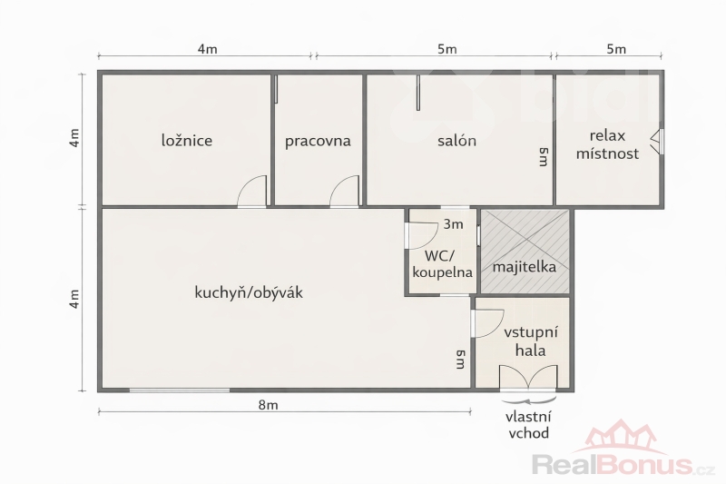 | Popis vybavení | Dispozice prostoru nabízí obytnou kuchyň s obývací částí o velikosti 32 m² (8 × 4 m), která tvoří hlavní společenský prostor. Dále je k dispozici ložnice o velikosti 10 m² (4 × 2,5 m) a samostatná pracovna o velikosti 5 m² (2 × 2,5 m), vhodná například pro klidnou práci. Součástí je také koupelna s WC o velikosti 6 m² (3 × 2 m) a vstupní chodba o velikosti 7,5 m² (3 × 2,5 m), která zajišťuje praktické propojení jednotlivých částí. Velkou přidanou hodnotou prostoru jsou dva samostatné pokoje o velikosti 22,5 m² (4,5 × 5 m), které jsou ideální jako pracovní salón a konzultační místnost. Tyto místnosti umožňují vytvořit plnohodnotné zázemí pro práci s klientkami, například pro terapii, masáže, koučink nebo jiné služby. Celková užitná plocha činí cca 105,5 m². |