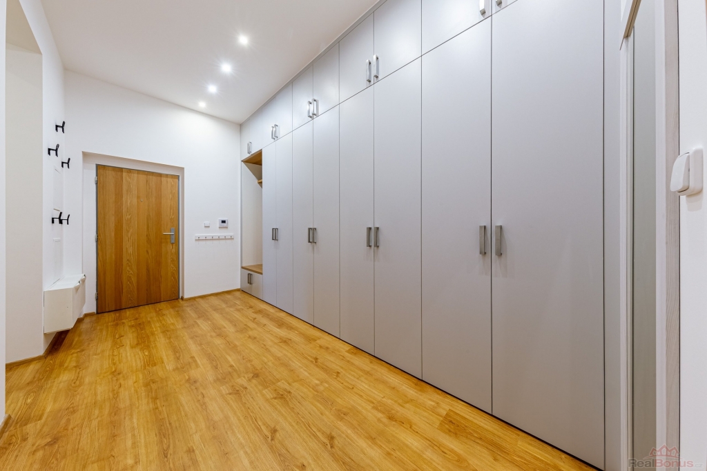 Dispozici bytu tvoří obývací pokoj včetně kuchyně s přístupem na balkón, dvě velké ložnice, chodba s vestavěnými skříněmi, samostatné WC, koupelna s vanou i sprchovým koutem. Kuchyňská linka je vybavená vestavěnými spotřebiči (myčka, horkovzdušná trouba, sklokeramická varná deska, digestoř).