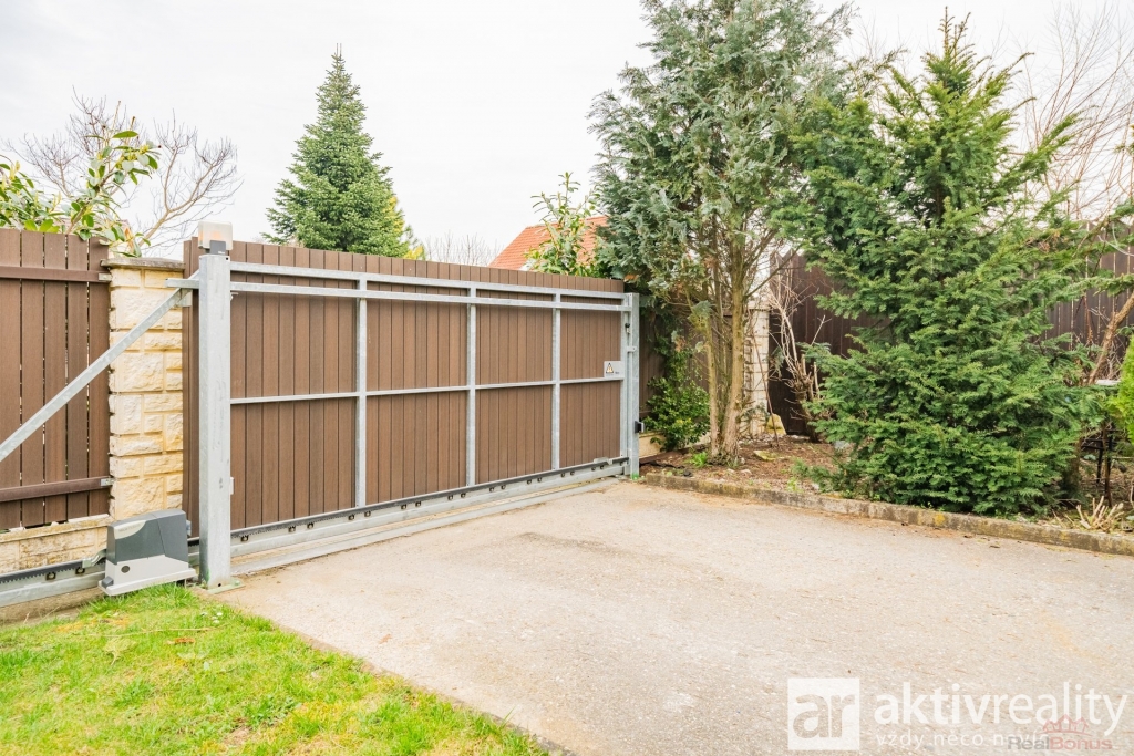 Pozemek je upraven s důrazem na praktičnost i soukromí. K dispozici je kryté parkovací stání pro dva vozy, vjezd je řešen elektricky ovládanou bránou a okolí domu je vydlážděno zámkovou dlažbou. Zahrada je orientována na jih, je vzrostlá a poskytuje příjemné soukromí bez rušivých vlivů okolí. Součástí je také zahradní domek a další úložný prostor na půdě domu.