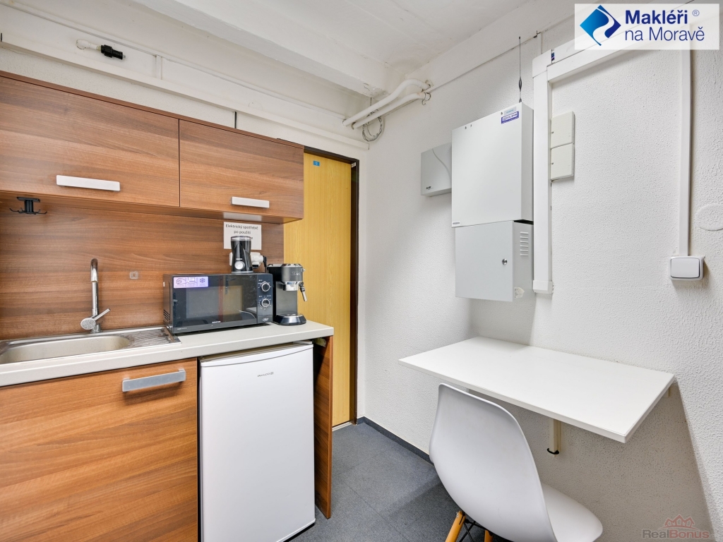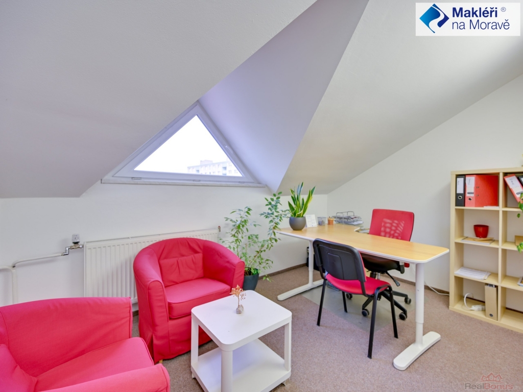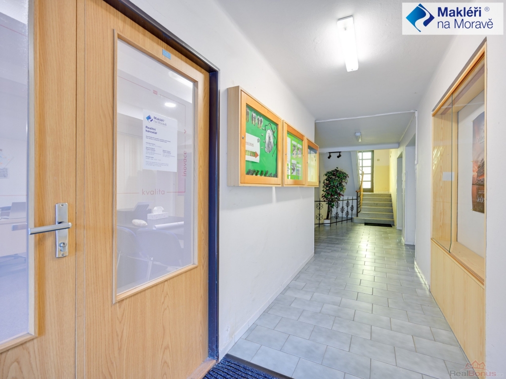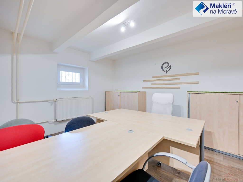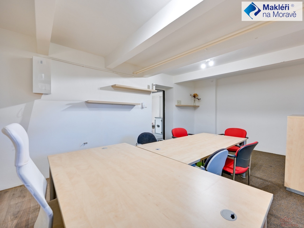 Budova má dvě čísla popisné ? jedna část je pouze přízemní ? dvě místnosti (v současnosti je zde banka) + kuchyňka a sociální zázemí. Druhá část budovy má čtyři patra. V současnosti bez výtahu. Tato část budovy je využívaná jako administrativní budova (plně obsazena nájemníky). V přízemí je kancelář ze soc. zázemím, sklep a kotelna. Ve 2. nadzemním podlaží jsou čtyři kanceláře s velkou zasedací místností, kuchyňkou, komorou, dvě samostatné toalety a dvě koupelny se sprchovým koutem a umyvadlem. Ve 3. nadzemním podlaží je dispozice stejná jako ve 2. nadzemním podlaží. V podkroví ? 4. nadzemním podlaží se nachází šest kanceláří, dvě kuchyňky, technické zázemí, dvě toalety a koupelna s umyvadlem a vanou. Ve druhém a třetím podlaží jsou dva balkóny, ve třetím podlaží je balkón jeden.