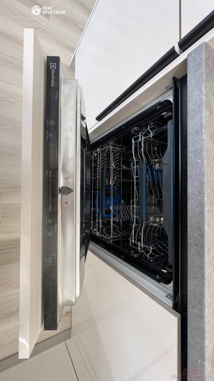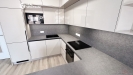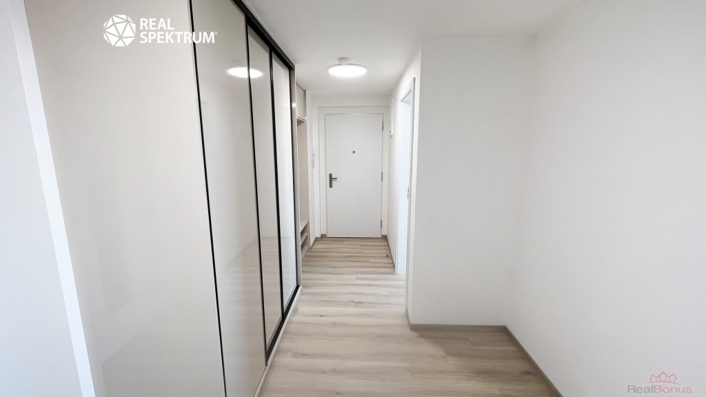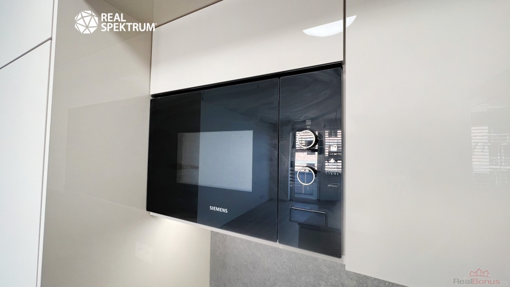 kuchyňská linka včetně spotřebičů (lednice s mrazákem, myčka, mikrovlnná trouba, digestoř, varná deska, trouba), koupelna a WC (příprava na pračku), vestavěná skříň, předokenní elektrické žaluzie.