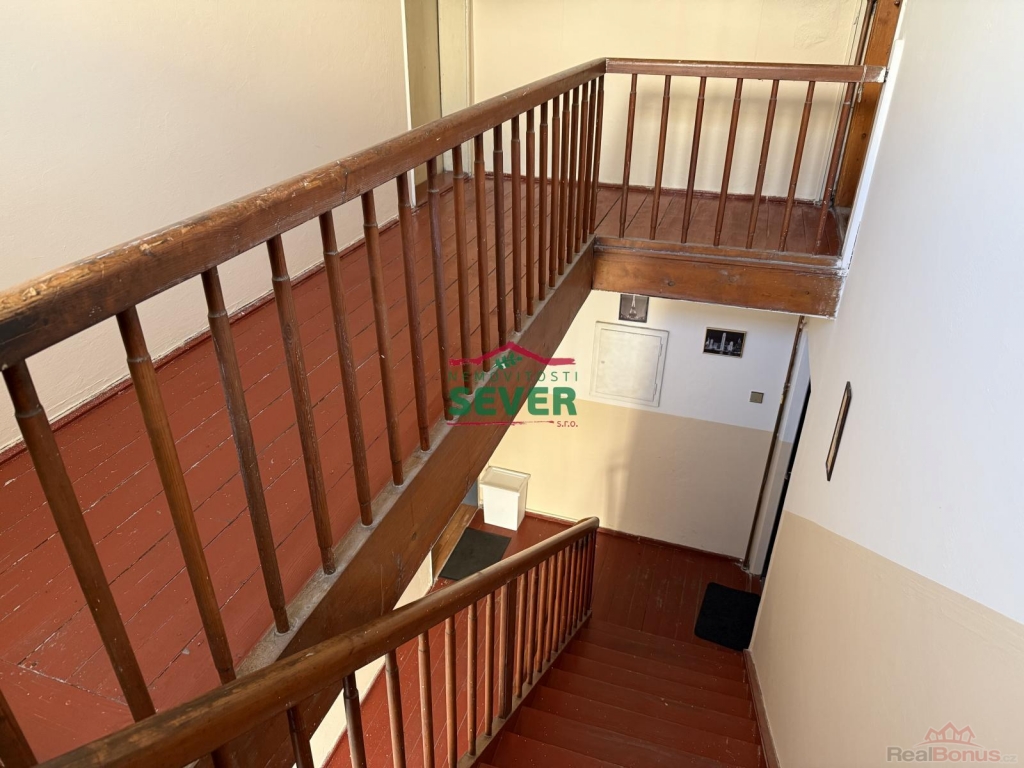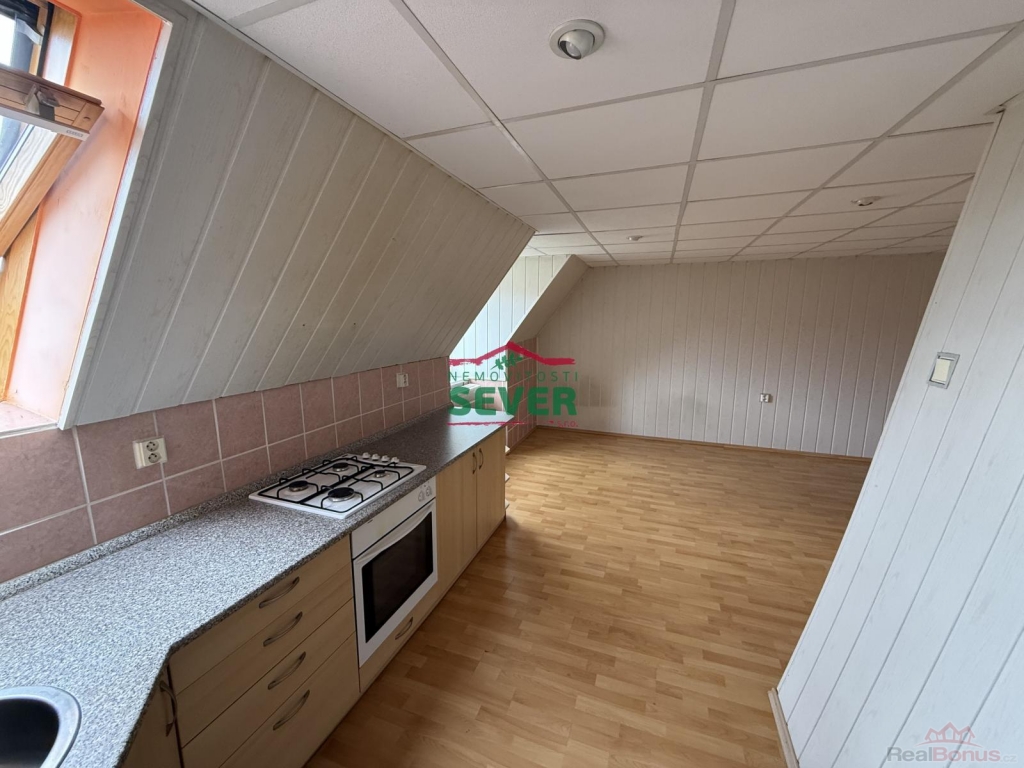 Nemovitosti SEVER vám zprostředkují prodej bytu 2+kk v osobním podílovém spoluvlastnictví, Horní Litvínov, okr. Most, Komenského. Bytová jednotka po částečné rekonstrukci, o výměře 48 m2, se nachází ve třetím nadzemním podlaží cihlového domu a jeho součástí je velký sklep, půda a pozemek za domem, který se používá jako zahrada k relaxaci. Půdní prostor lze dokoupit k vytvoření další místnosti. V podkrovním bytě je kuchyně propojena s obývacím pokojem. Je zde nová rohová kuchyňská linka obložena dlaždičkami, kombinovaný sporák, na zemi plovoucí podlaha. V ložnici je krytina PVC a zadní místnost jde používat jako šatna. Jsou zde nová okna Velux, dřevěné dveře se zárubněmi, rozvody vody v plastu a topení v mědi. Koupelna a WC jsou společné ve zděném jádru, v částečném keramickém obkladu. Je zde sprchový kout, přípojka na pračku, odvětrávací okno a plynová karma na ohřev vody. Vytápění bytu je řešeno plynovými gamaty. Byt je možné zakoupit i s nájemníkem na investici. Dům se nachází v klidné části města bez problémových nájemníků v blízkosti centra města.