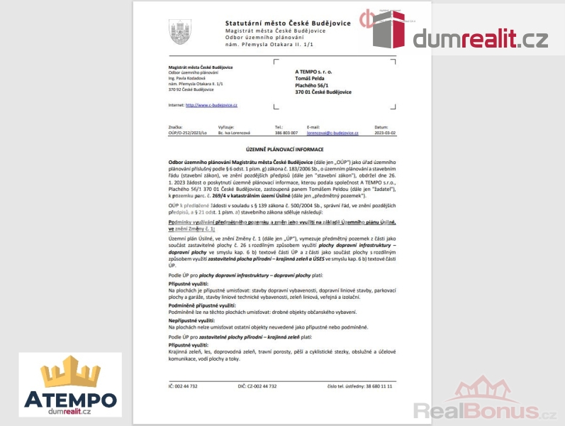 Cena je včetně provize RK a právního servisu. Více informací Vám poskytne makléř Tomáš Pelda., Dumrealit.cz Vám zprostředkuje prodej stavebního pozemku o rozloze 6.439 m v Úsilném ve městě České Budějovice. Pozemek par. číslo 269/4 zapsaný na LV 167 v kú Úsilné. Územně plánovací informaci s informacemi o možnosti zástavby na pozemku naleznete mezi fotografiemi. Ve vzdálenosti cca 600 m vede plyn, vodovod a kanalizace. Doporučuji prohlídku, pozemek se nachází cca 10 minut od centra města České Budějovice. K dispozici máme kompletní zákres inženýrských sítí, Územně plánovací informaci s možnostmi zástavby a využití pozemku. Možnost koupě i 2. pozemku vyznačeného červeně na fotografiích, par. č. 271/3 zapsané v k.ú. Úsilné. Více informací Vám poskytne realitní makléř Tomáš Pelda z realitní kanceláře A TEMPO fungující pod ochrannou známkou dumrealit.cz. Ev. číslo: 642996.