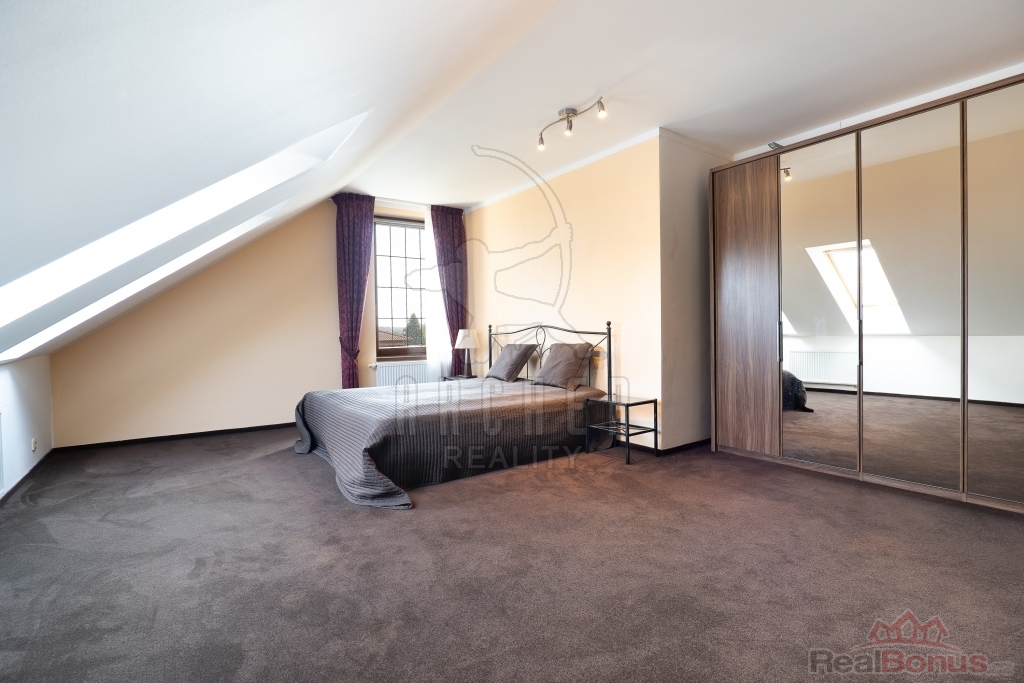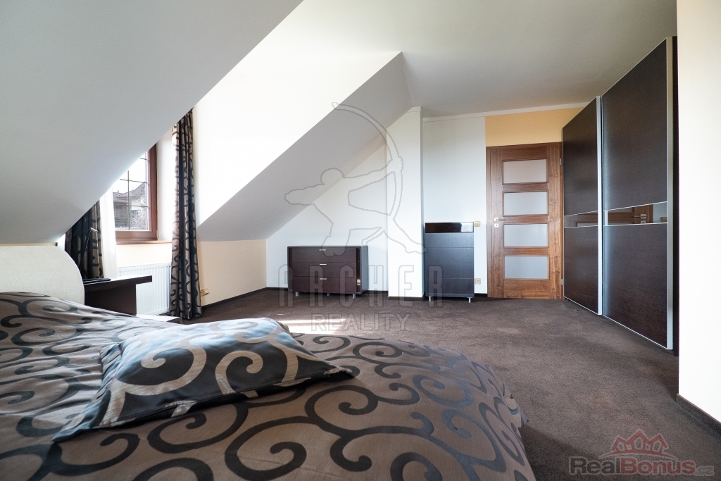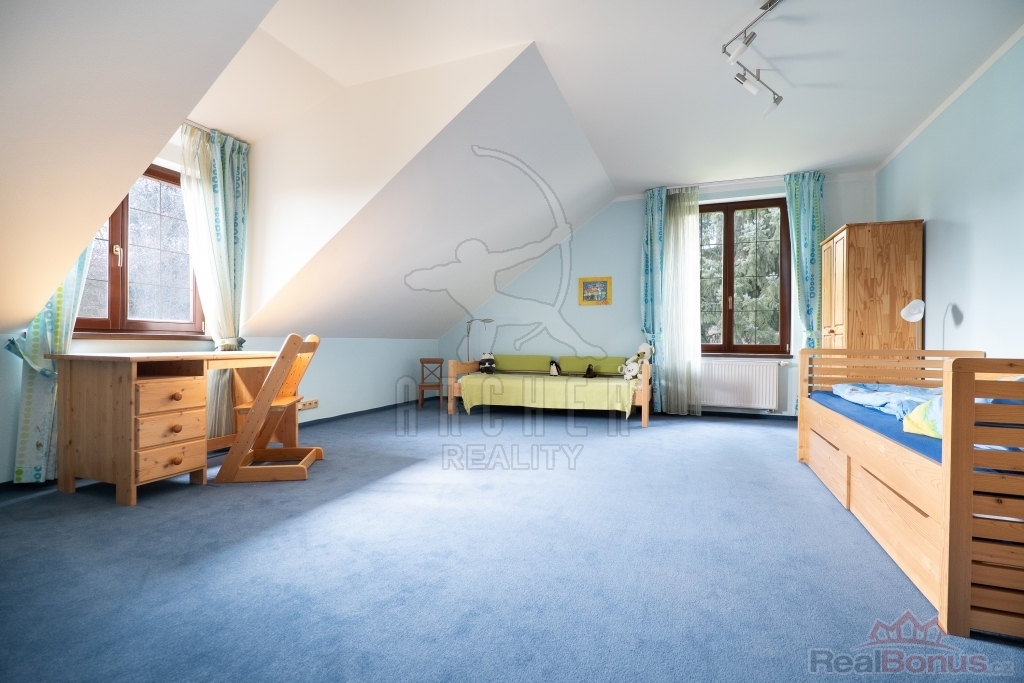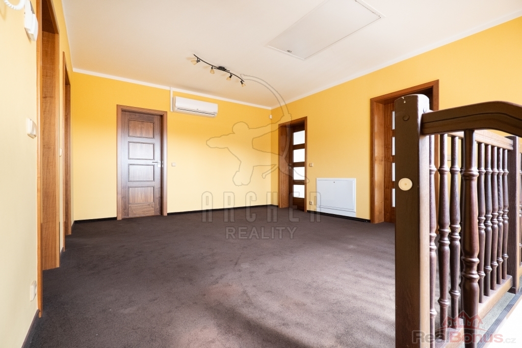 Patro domu je propojeno schodištěm s masivními nášlapy a nabízí prostornou galerii, čtyři neprůchozí pokoje a komfortní rodinné zázemí - velkou koupelnu s rohovou vanou a toaletou a bonus vlastní koupelny jako součást hlavní ložnice.