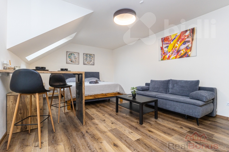 Obývací pokoj a kuchyňský kout - skříňky na míru, stůl a rozkládací sedací souprava, vstup na terasu, dominantou pokoje je manželská postel, nad kterou je střešní okno. Plně vybavená kuchyňská linka (vestavná kombinovaná mikrovlnná trouba s grilem, myčka, varná deska, odsavač par). Celková kapacita apartmánu je až 4 osoby, popřípadě lze přidat i přistýlku, což představuje ideální příležitost pro investici do rekreačního bydlení v oblíbené lokalitě Jeseníků. V blízkosti nemovitosti se nachází fungující restaurace, kde lze zajistit stravování pro hosty při pronájmu apartmánu. Náklady na bydlení jsou 2013kč a elektřina dle spotřeby. K apartmánu náleží sklepní koje 3m2 a možnost parkování před domem. Nemovitost má vlastní webové stránky a je plně řízená systémem JABLOTRON. Ve městě Vrbno pod Pradědem je velice dobrá občanská vybavenost. Jsou zde dva supermarkety, pošta, banka, MŠ a ZŠ, zdravotnické služby provozované privátními lékaři, výjezdová stanice Rychlé záchranné služby, centrum kultury a vzdělávání, které vám poskytne široký výběr kulturních akcí.