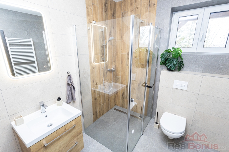 Koupelna s WC - sprchový kout, elektrický žebřík, místo pro pračku a bojler