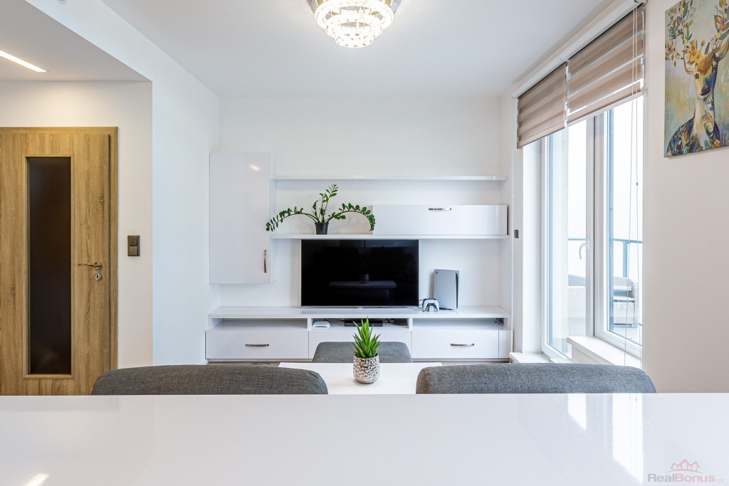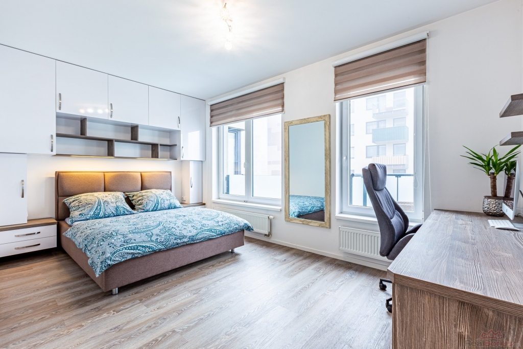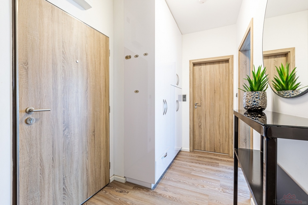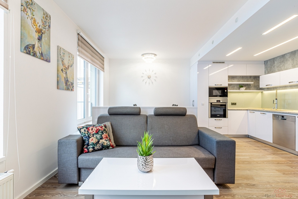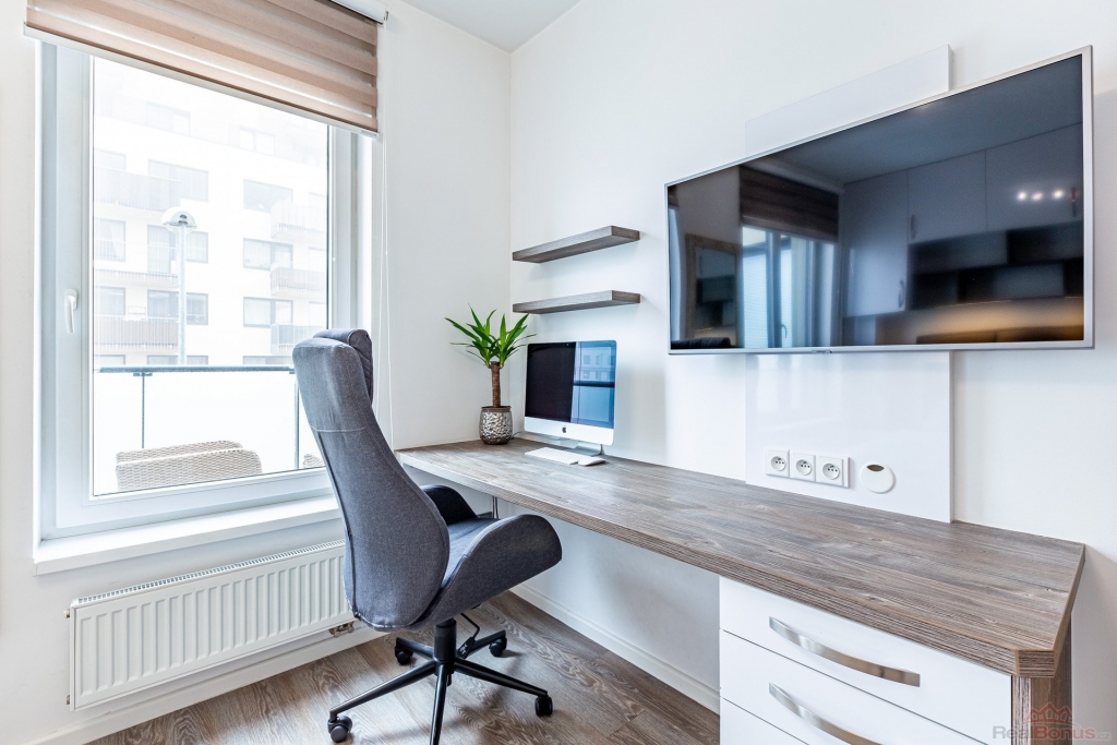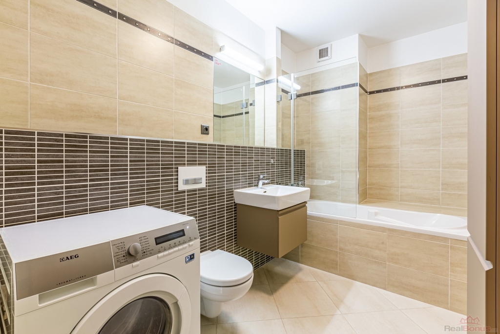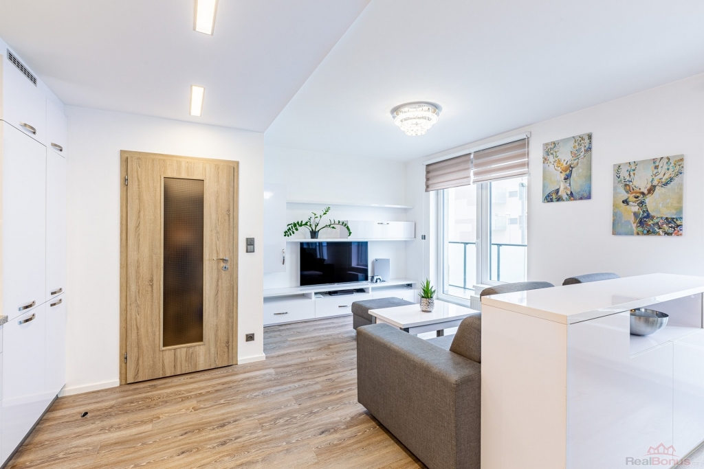 Dispozici bytu tvoří obývací pokoj s kuchyňským koutem a vstupem na terasu, ložnice, koupelna s vanou a toaletou, vstupní předsíň. V prostorné kuchyňské lince jsou zabudované vestavné spotřebiče vysoké kvality, v koupelně je podlahové topení a otopný žebřík. Byt se pronajímá plně zařízený - nábytek na míru, TV, v koupelně je pračka/sušička.