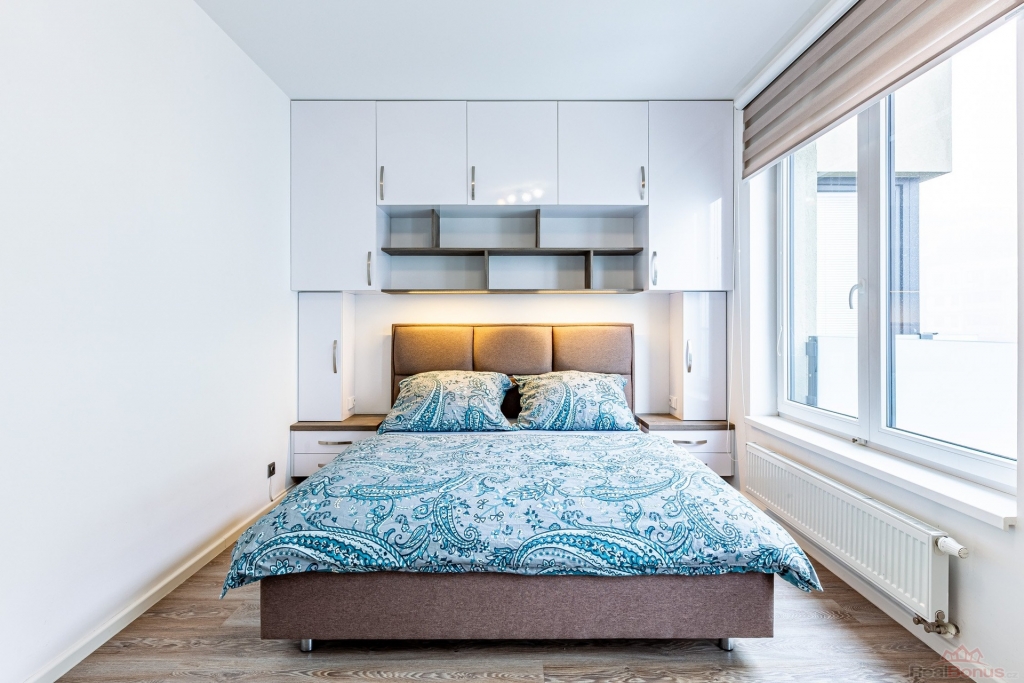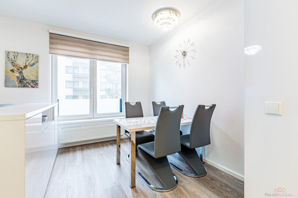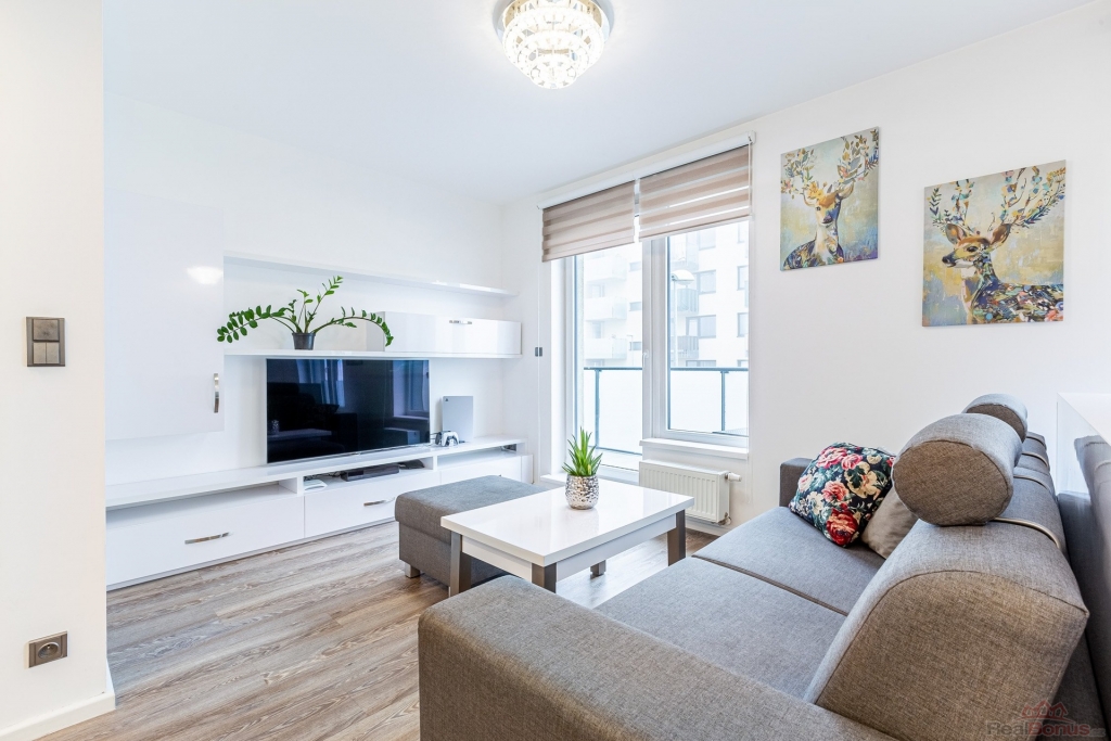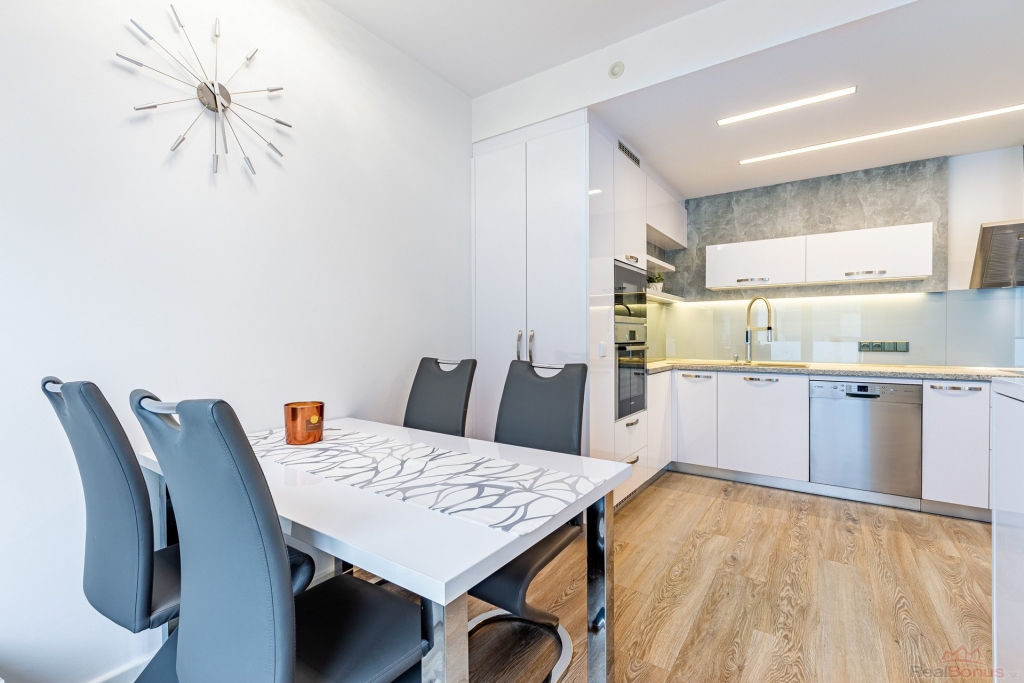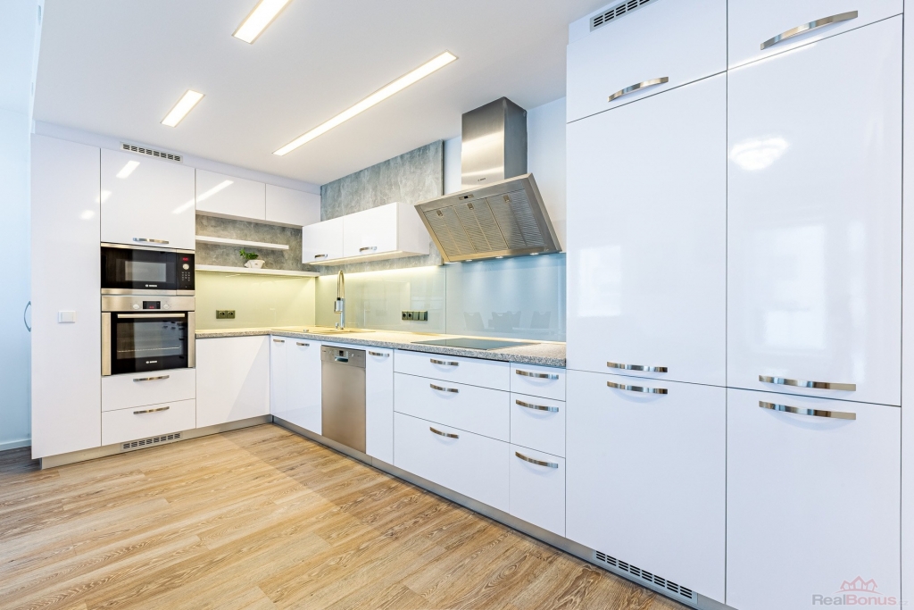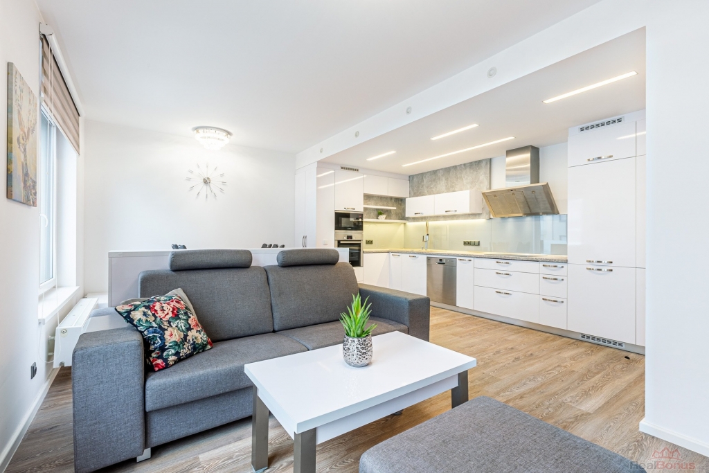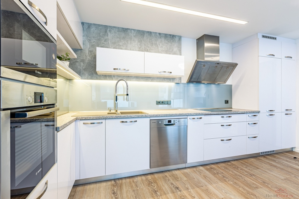 Dispozici bytu tvoří obývací pokoj s kuchyňským koutem a vstupem na terasu, ložnice, koupelna s vanou a toaletou, vstupní předsíň. V prostorné kuchyňské lince jsou zabudované vestavné spotřebiče vysoké kvality, v koupelně je podlahové topení a otopný žebřík. Byt se pronajímá plně zařízený - nábytek na míru, TV, v koupelně je pračka/sušička.