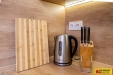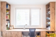 Dominantou je rohová kuchyňská linka na míru se spotřebiči (myčka, trouba, indukce, digestoř, mikrovlnná trouba), skříňky až do stropu a praktická potravinová skříň.