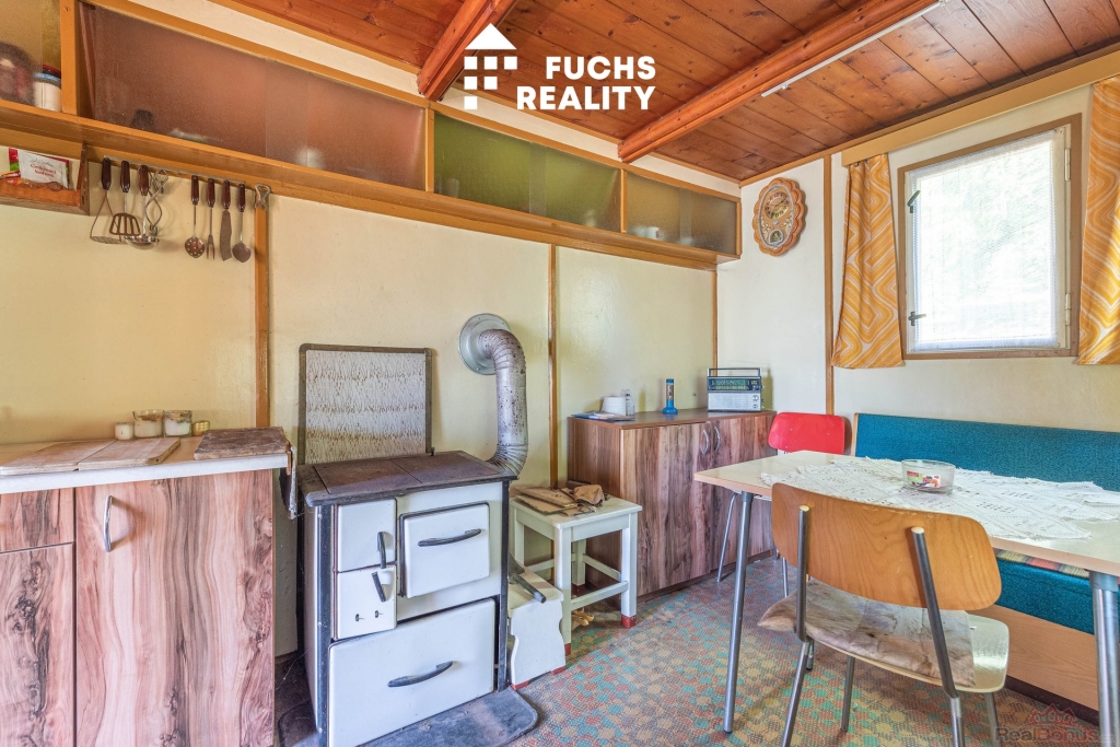 Dispozice chaty zahrnuje zádveří, obytnou místnost s kuchyňským koutem a podkroví s balkonem, odkud je krásný výhled do okolní přírody. Nechybí ani sklep, kolna a suché WC. Na pozemku je přípojka a rozvod obecního vodovodu, elektřina se nachází na hranici pozemku s možností napojení.