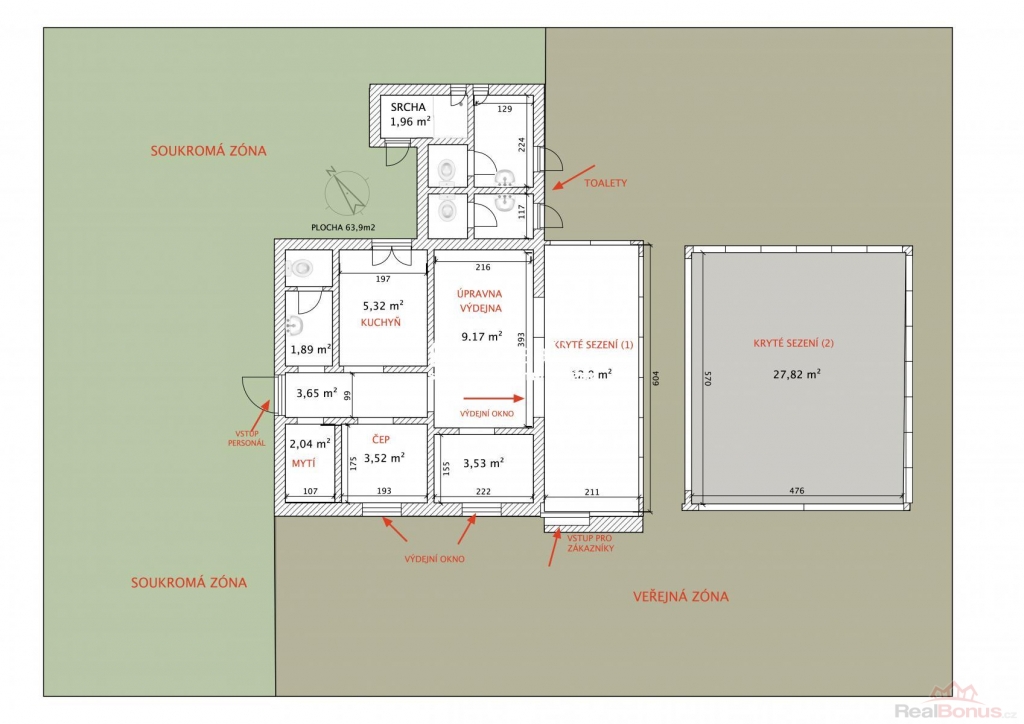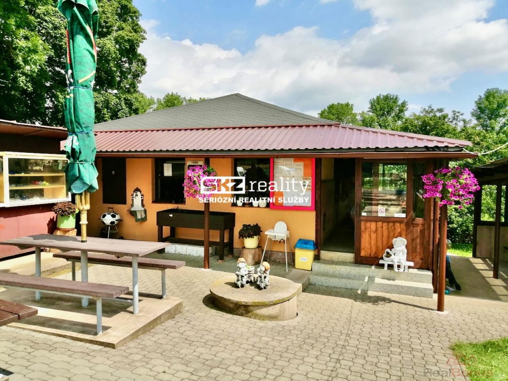 Základem všeho je zděná stavba, kde najdete vše, co k provozování hostinství potřebujete. Dispozice jsou znázorněny na fotografii půdorysu. Zadním vstupem se dostanete do chodby. Vlevo se nachází 2 prostory: WC s umyvadlem a kuchyně. Vpravo je přípravna, čep s výdejním okénkem a prostor pro výdej zmrzliny. Výdej jídel, fritéza, konvektomat, mikrovlná trouba atd. je největším pracovním prostorem a je na konci chodby s výdejním oknem do prostoru uzavřeného posezení pro hosty. Dispoziční uspořádání stavby je deální pro rychlou a pohodlnou přípravu jídel a nápojů se snadným obstaráváním hostů. Na severovýchodní straně se nachází přístavba, kde najdete WC pro hosty a sprchový kout pro personál. Součástí nabídky je mj. vagon, karavan, dva prodejní stánky a 2 foliovníky. Lze využít i studnu pro čerpání užitkové vody.