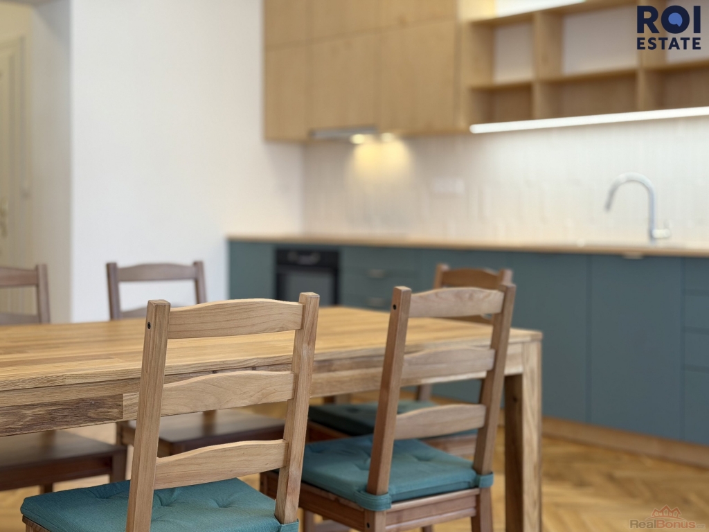 Byt disponuje moderně řešeným kuchyňským koutem, který je plně vybaven spotřebiči a plynule navazuje na obývací část. Součástí je také jídelní stůl se židlemi. K dispozici jsou dvě samostatné ložnice, ideální pro rodinu, pár nebo spolubydlení.