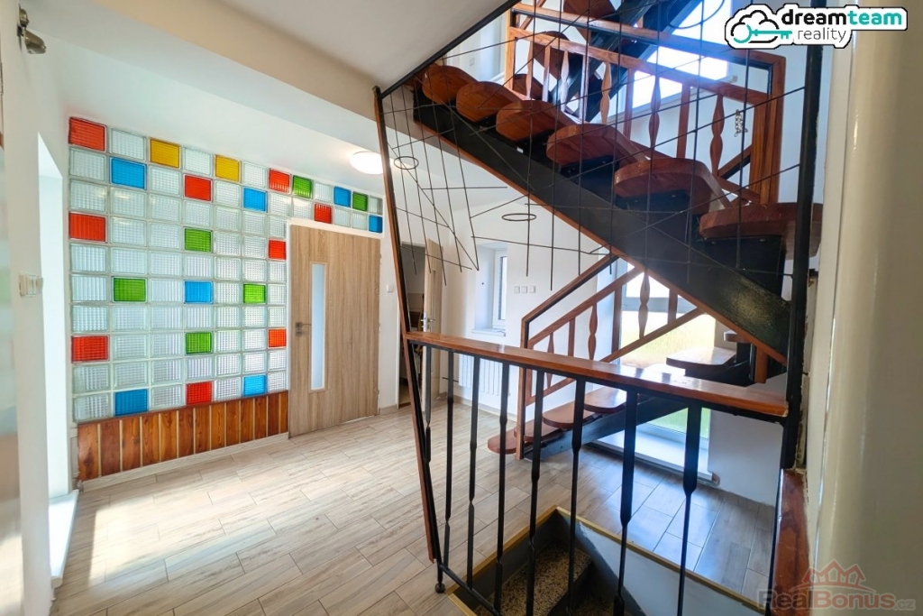 Přízemí nabízí kompletní byt 2+1+jídelna se zrekonstruovanou kuchyní, koupelnou a toaletou ? ideální třeba pro rodiče bez nutnosti chodit do schodů. V patře čtyři místnosti, druhá koupelna a toaleta. Druhá kuchyň by se tu dala vybudovat. Každé patro má balkón orientovaný na jihozápad, oba cca 6 m2, spodní zastřešený ? kafíčko za každého počasí.