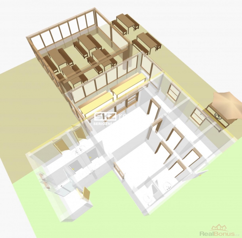 Základem všeho je zděná stavba, kde najdete vše, co k provozování hostinství potřebujete. Dispozice jsou znázorněny na fotografii půdorysu. Zadním vstupem se dostanete do chodby. Vlevo se nachází 2 prostory: WC s umyvadlem a kuchyně. Vpravo je přípravna, čep s výdejním okénkem a prostor pro výdej zmrzliny. Výdej jídel, fritéza, konvektomat, mikrovlná trouba atd. je největším pracovním prostorem a je na konci chodby s výdejním oknem do prostoru uzavřeného posezení pro hosty. Dispoziční uspořádání stavby je deální pro rychlou a pohodlnou přípravu jídel a nápojů se snadným obstaráváním hostů. Na severovýchodní straně se nachází přístavba, kde najdete WC pro hosty a sprchový kout pro personál. Součástí nabídky je mj. vagon, karavan, dva prodejní stánky a 2 foliovníky. Lze využít i studnu pro čerpání užitkové vody.