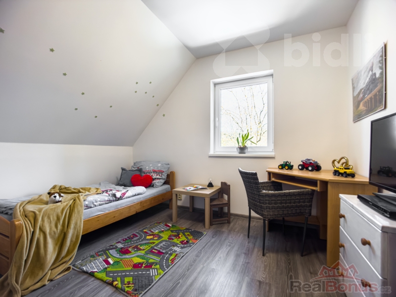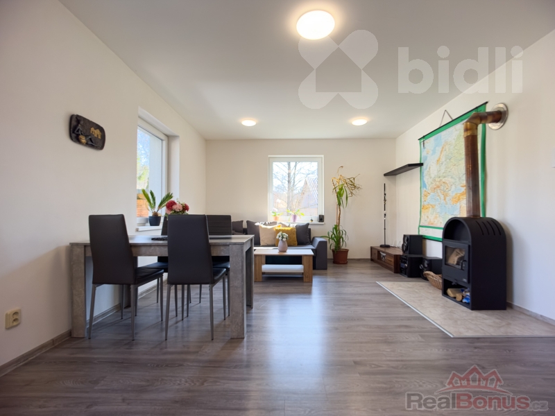 Dispozice domu 4+1, kde v přízemí je vstupní chodba, prostorný obývací pokoj s jídelním koutem a novou plně vybavenou kuchyní se spotřebiči, koupelna se sprchovým koutem a WC. Po schodech se dostaneme do 1. patra kde je ložnice a dva dětské pokoje (či pracovna), samostatné WC.