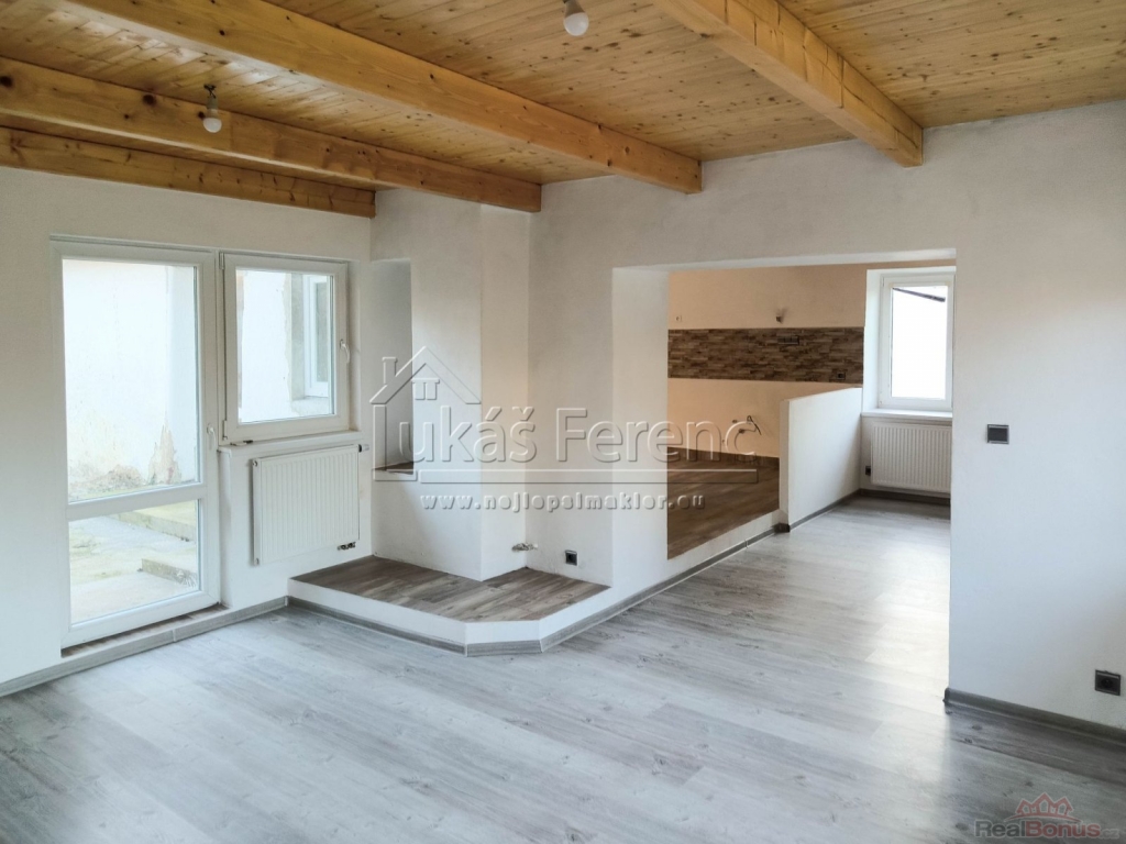 nové dřevěné stropy v obývacím pokoji a jídelně,