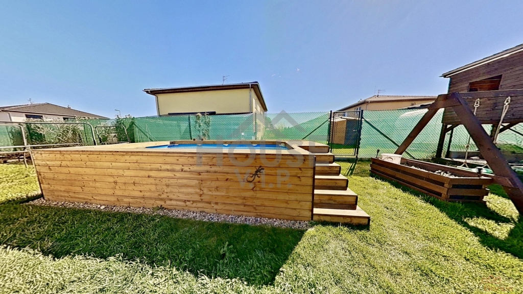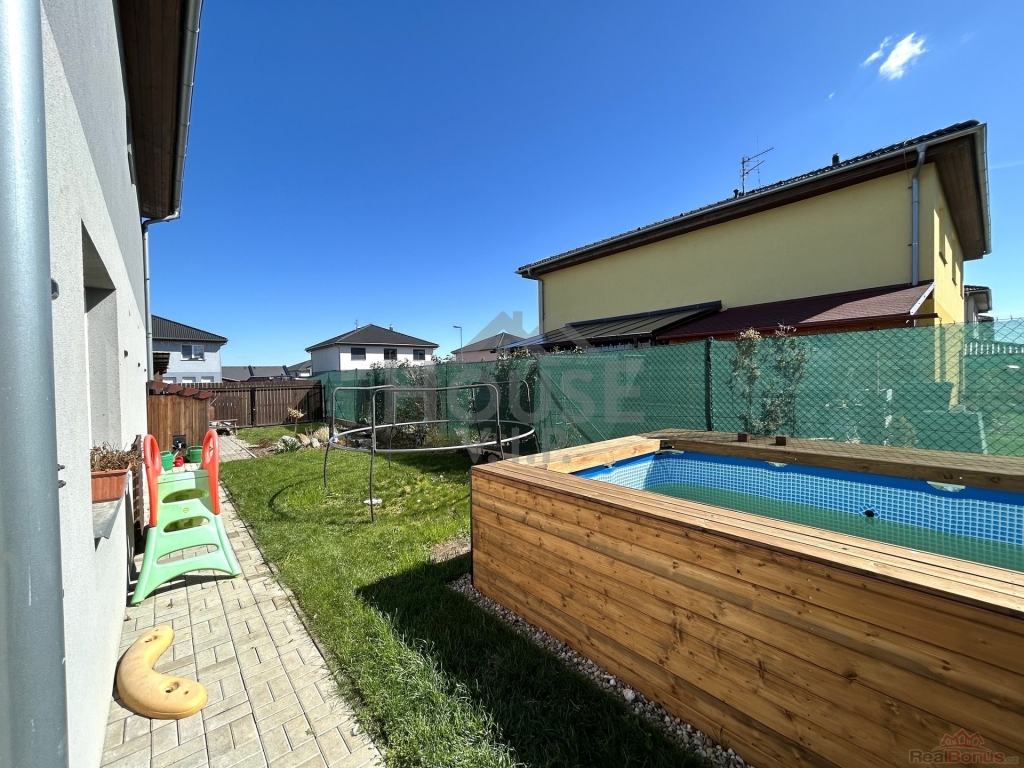 Součástí nemovitosti je soukromá zahrada o velikosti 260 m2 s bazénem, terasou s pergolou (20 m2) a zahradním domkem (15 m2) vhodným na nářadí či kola.