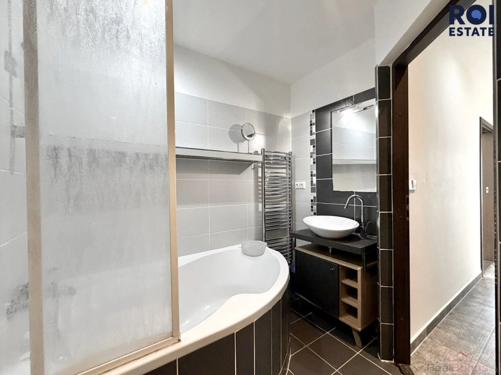 Koupelna (4,6 m2) s rohovou vanou, sprchovým koutem, umyvadlem a Geberitem