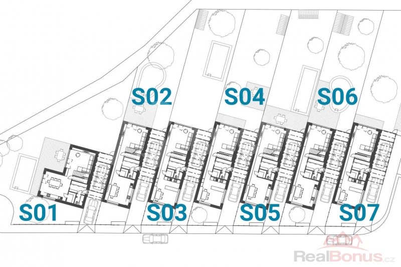 V přízemí domu S 04, s celkovou užitnou plochou 165 m2, se nachází zádveří (6 m2), WC (2 m2), chodba (10 m2), samostatná kuchyně s jídelnou (21,5 m2), spíž (2 m2), obývací pokoj (18,5 m2) s přímým vstupem na zahradu, 2 x sklad (2 m2 a 4,5 m2) a garáž (15,5 m2). V patře jsou 3 neprůchozí pokoje (17 m2, 10 m2, 11,5 m2) s prostornou koupelnou (6,5 m2) a s terasou (27,5 m2).