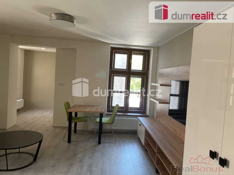 + energie + kauce + provize, Dumrealit.cz Vám zprostředkuje pronájem celkově zrekonstruovaného a kompletně zařízeného bytu s dispozicí 1+kk+ šatna a podlahovou plochou 49m umístěného v centru města Opavy. Tento luxusní byt je umístěn ve 2.NP cihlové budovy a sestává z předsíně (8,25m), koupelny se sprchovým koutem a WC (6,12m), obývacím pokojem s kuchyní (31,74m) a šatnou (3,05m). Byt je kompletně vybaven odkládací stěnou, šatními skříněmi, kuchyňskou linkou s indukční deskou a el. troubou zn. Electrolux, odsávačem par zn. Mora a lednicí zn. Snaigé, jídelním stolem se 2mi židlemi, televizní stěnou s televizí zn. Samsung, křeslem a postelí s odkládacím stolkem. Vytápění zajištěno vlastním elektrickým kotlem. Měsíční nájemné činí 17.500,- Kč + záloha 3 . 500 Kč spotřeba vody a tepla . Zálohy na spotřebu elektrické energie si stanoví nájemník sám po přepisu smlouvy o dodávkách. V bytě je internetové připojení (toto není součástí nájmu). Vratná kauce je ve výši 2 měsíčních nájmů včetně služeb . Jednorázová odměna za zprostředkování činí nájem jeden. V případě zájmu je možnost parkování ve dvoře za domem za 2 000,- Kč / měs. Každé další parkovací místo pak 1.500,- Kč / měs.