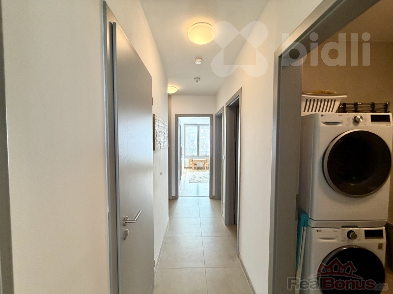Dispozici bytu tvoří vstupní chodba, technická místnost/komora, obývací pokoj s kuchyňskou částí a vstupem na lodžii, ložnice, dětský pokoj, koupelna s vanou a samostatné WC. Kuchyňská linka je moderní a vybavena vestavěnými spotřebiči. Součástí pronájmu je parkovací stání v garáži a sklep.