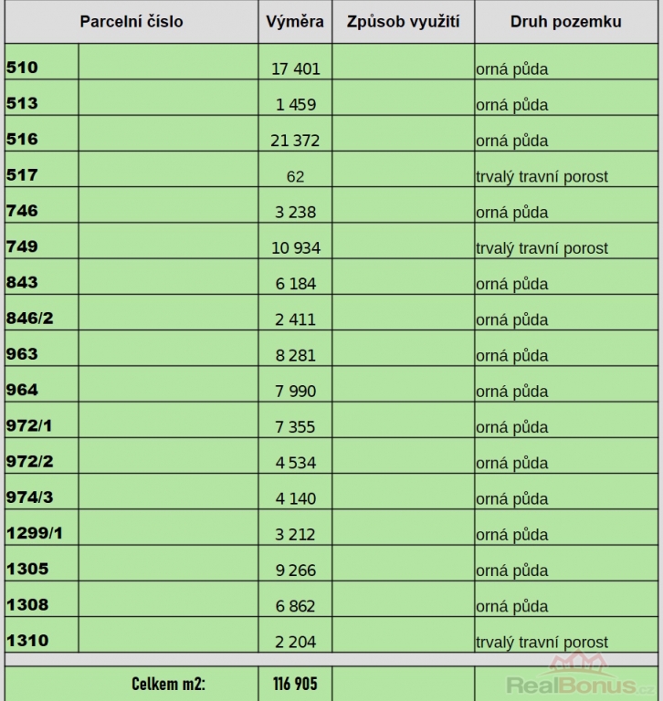 | Vlastní pozemek | 116 905 m² |