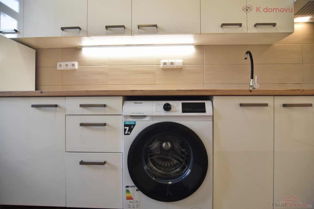 Kuchyně vybavena kuchyňskou linkou, plynovou varnou deskou s digestoří, troubou, pračkou a lednicí s mrazákem