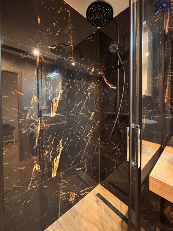Designová koupelna: Skutečná dominanta bytu. Kombinace luxusního černého mramoru a moderních doplňků vytváří atmosféru soukromého wellness.