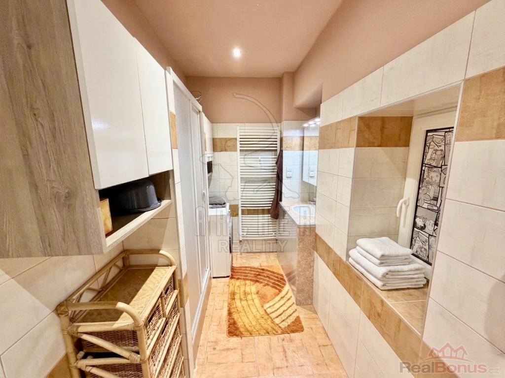 Byt nabízí velmi chytré a funkční řešení prostoru. K dispozici je dostatek úložných prostor přímo v bytě najdete špajzku i samostatnou šatnu. Velkým benefitem je také prostorná koupelna se sprchovým koutem, která působí vzdušně a komfortně.