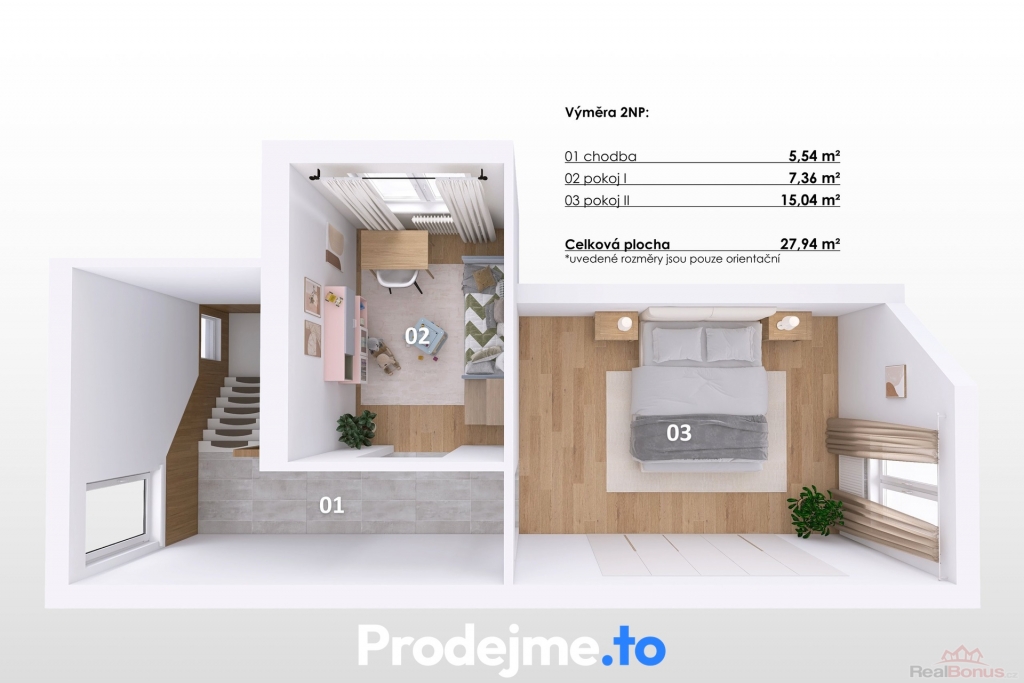 Patro naopak patří klidu a odpočinku. Dva pokoje o velikostech 15 m2 a 7 m2 jsou ideální jako hlavní ložnice a útulný dětský pokoj.